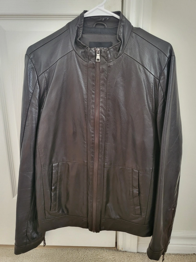 Brown leather jacket. Size XS/TP. Slim fit. Made in China.