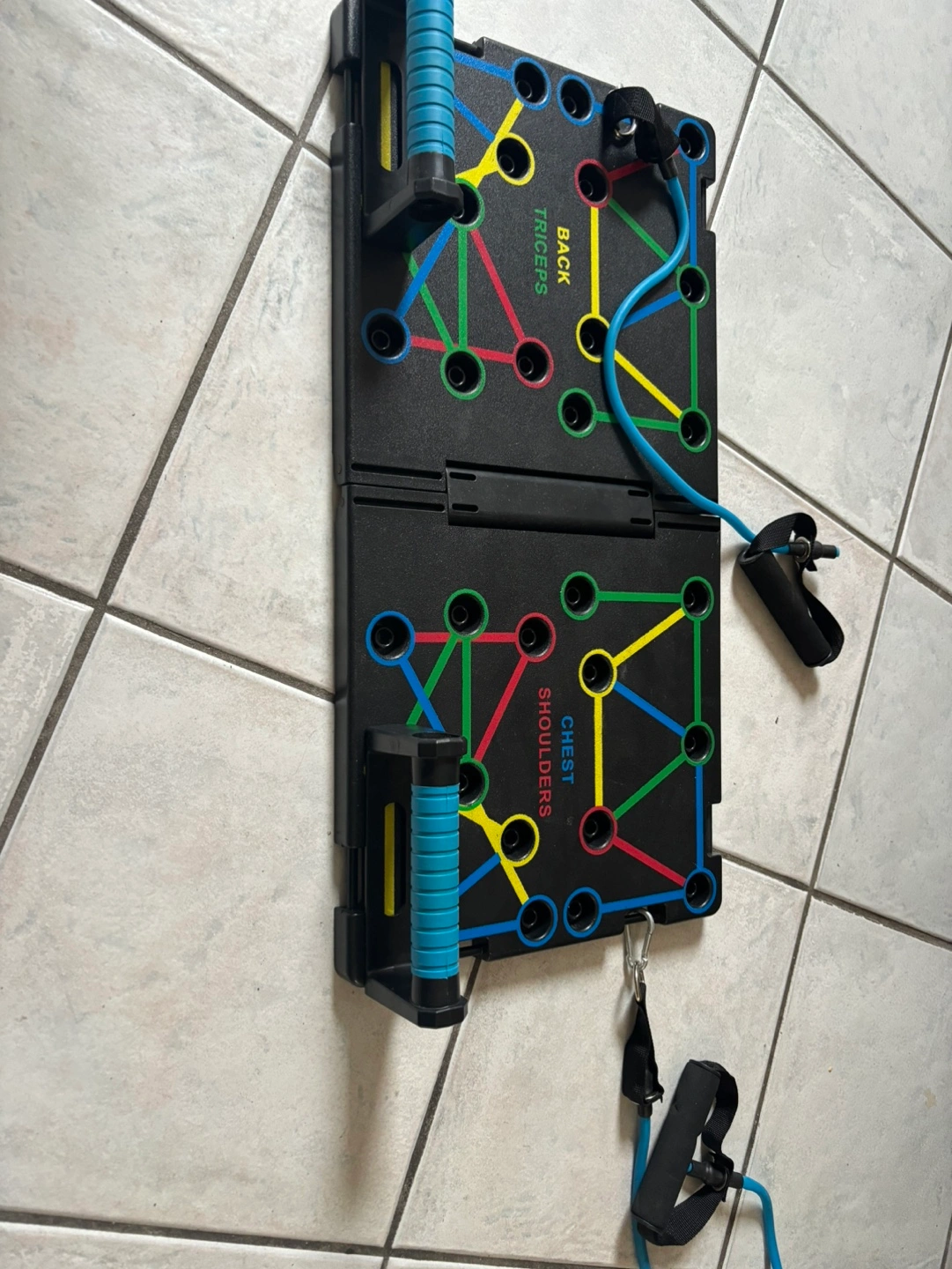 Workout board with resistance band. Includes multiple positions for targeting different muscle groups.