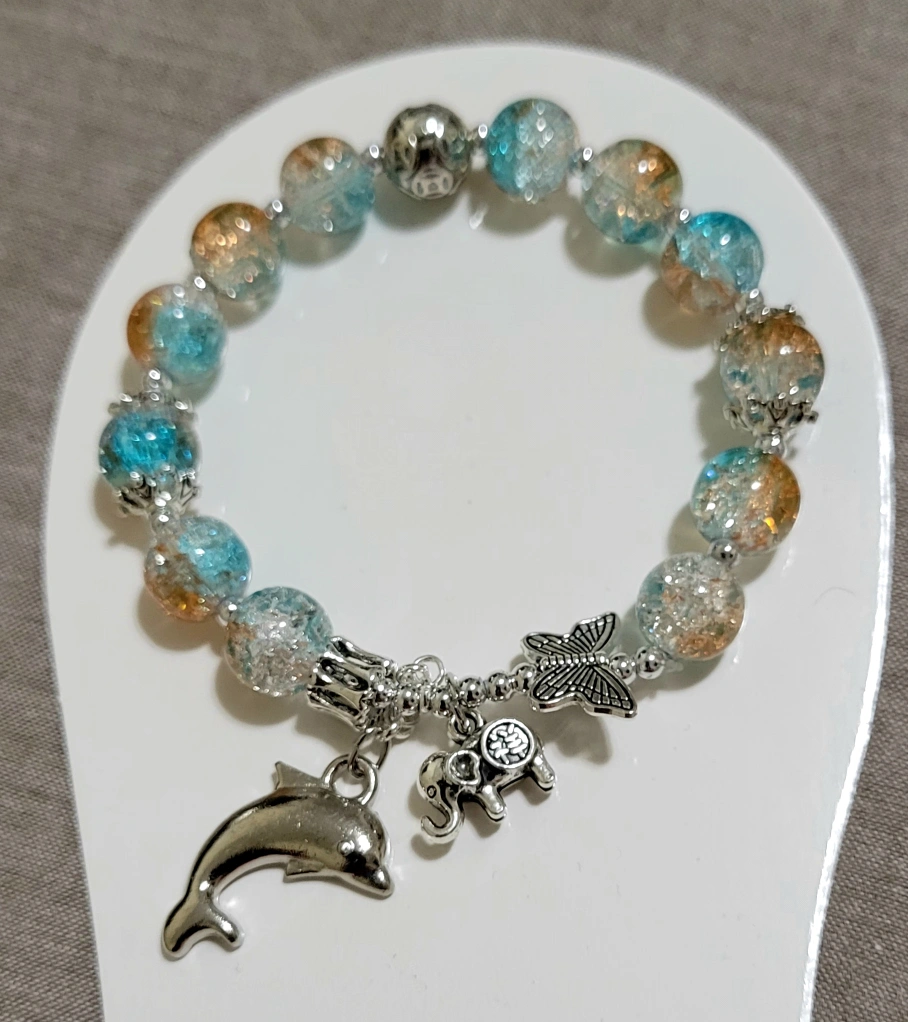 Two charm bracelets with different coloured beads. One has dark beads with a sun, moon, turtle, and butterfly charm. The other has blue and orange beads with a dolphin, butterfly, and elephant charm.