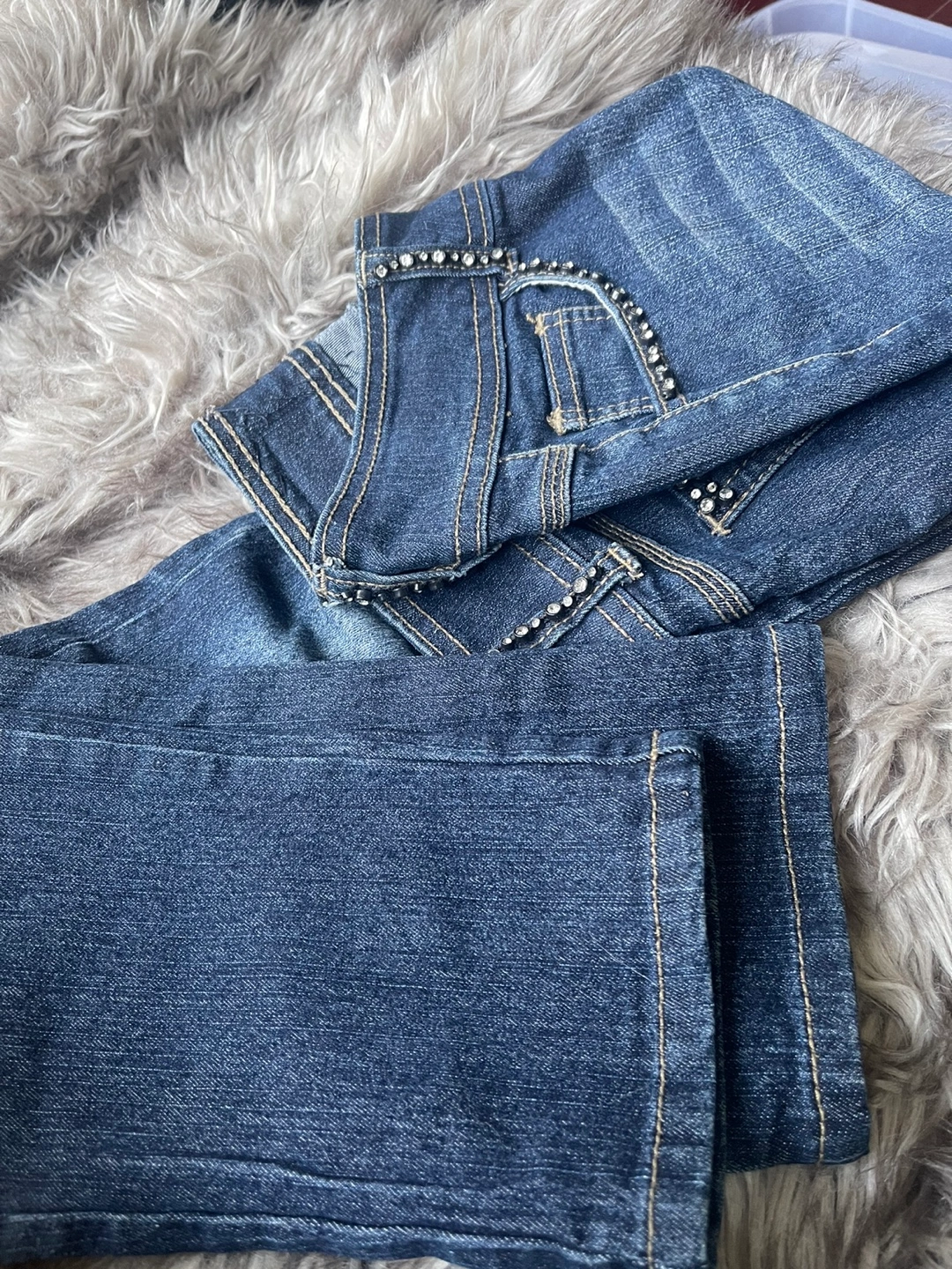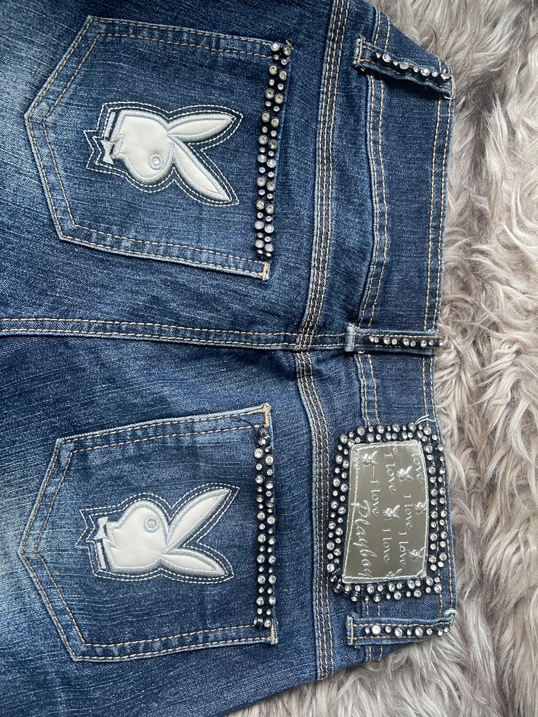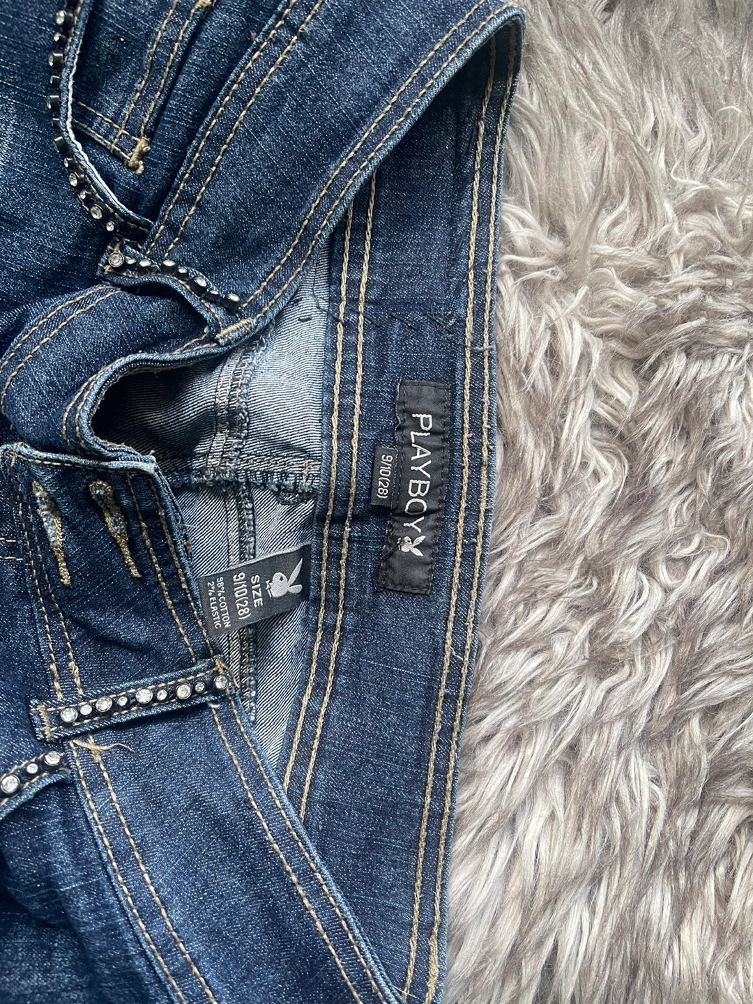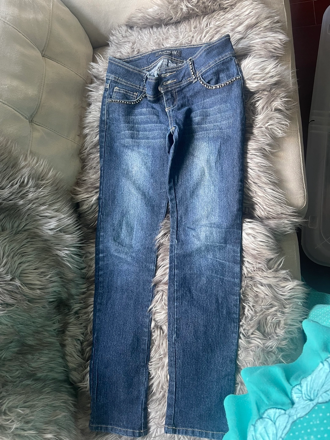 51Blue denim jeans with rhinestones and a Playboy logo on the back pockets. Size 28, straight leg. only try