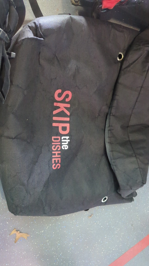 Black delivery bag with Shoulder(s) Strapes / hand carrying case , insulated Skip the Dishes logo. It is slightly worn but usable.