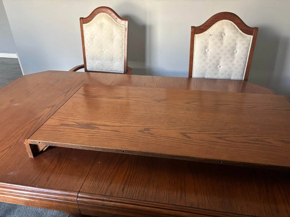 This dining room table and chairs set is great for large family gatherings. The fabric on the chairs needs to be cleaned and painted, but other than that, the table and chairs are in pretty decent condition. Pick up only.