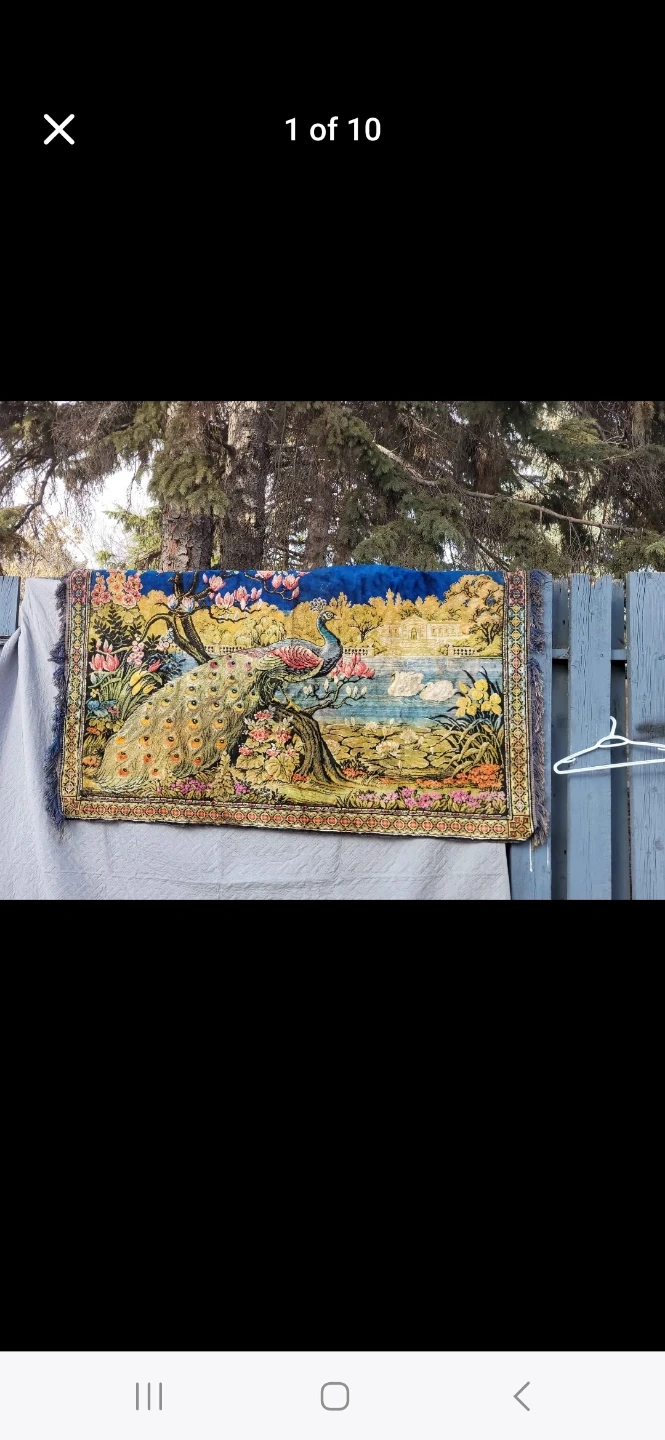 This is a vintage wall hanging featuring a vibrant peacock design. It's detailed with floral elements and a scenic background. The tapestry includes fringed edges.