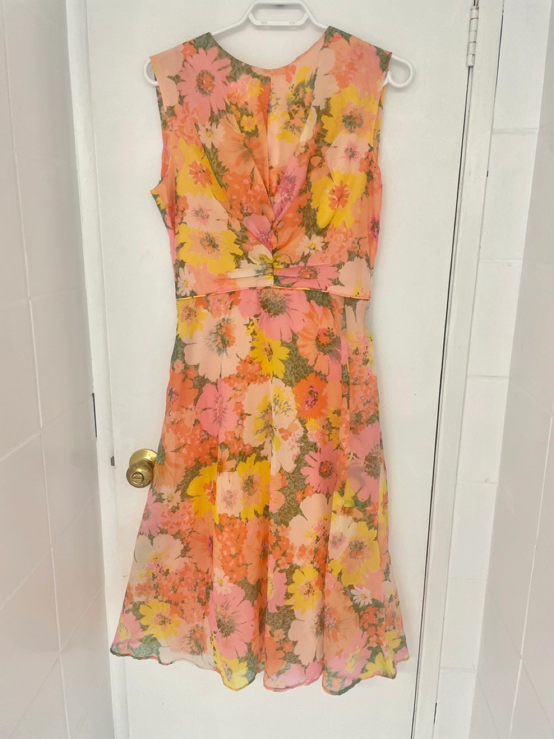 Sleeveless, floral dress. Pink, yellow, and orange colours. Lined and with a zipper. Absolutely stunning piece in excellent, like new condition. Pick up Steveston North.