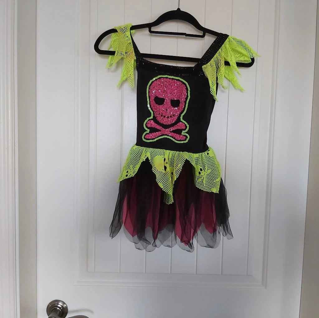 Black and pink costume dress with skull and crossbones design, neon green accents and tulle skirt. Size small.
