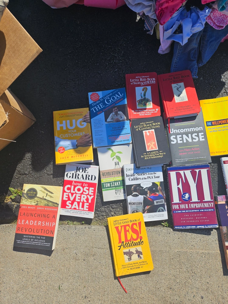 68Collection of hardcover and paperback books. Many different topics including leadership, sales, and personal development. Titles include: The Goal, Hug Your Customers, Joe Girard How to Close Every Sale, Launching a Leadership Revolution, Revolution, The Little Red Book of Sales and Service, The Little Gold Book of Connections, Uncommon Sense, The Willpower Instinct, Stonehenge Legacy, Strengths Finder 2.0, Weber's Way to Grill, Indoor Kitchen Gardening, and more.