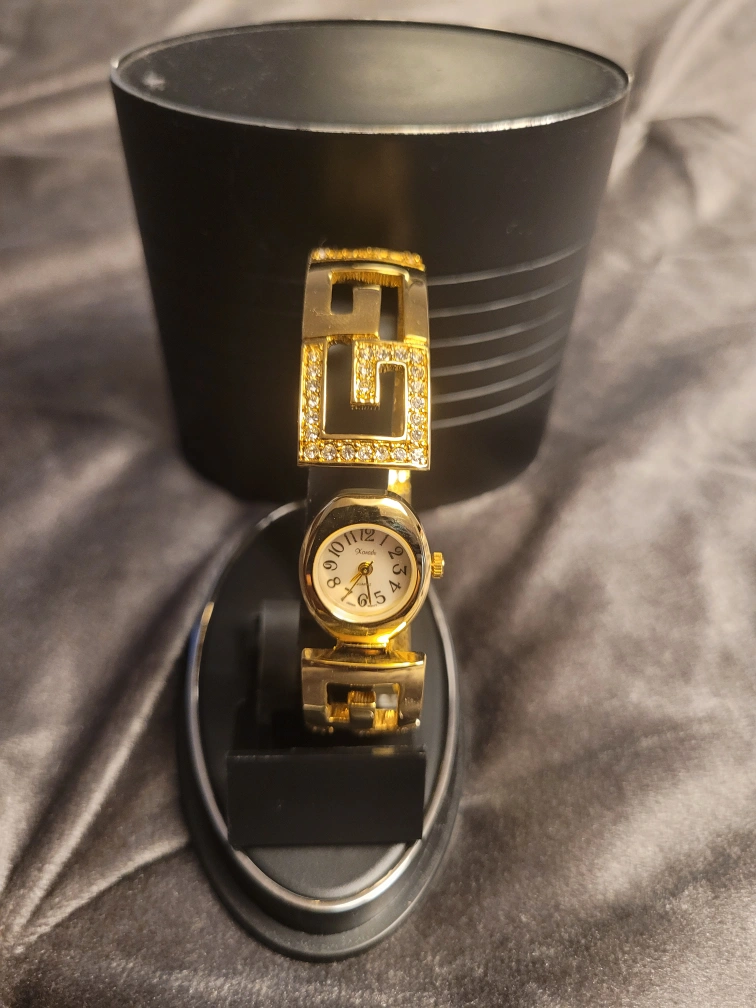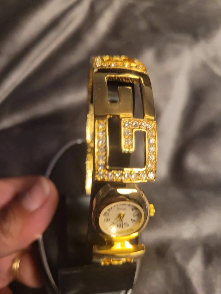 68Gold tone watch with rhinestone accents. Comes in original box.