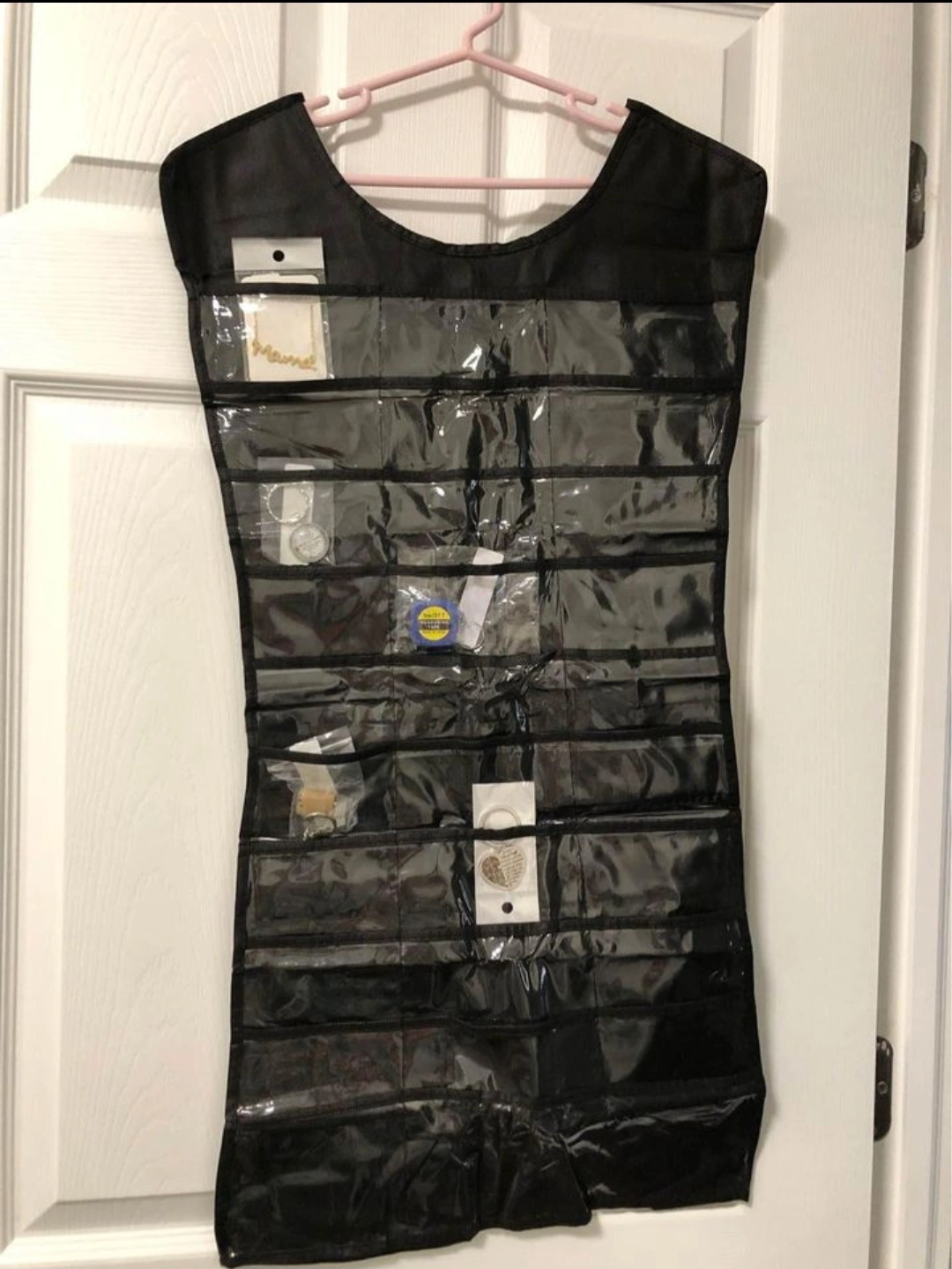 Black over-the-door organizer with clear plastic pockets. Great for storing necklaces, earrings, bracelets and other small accessories.