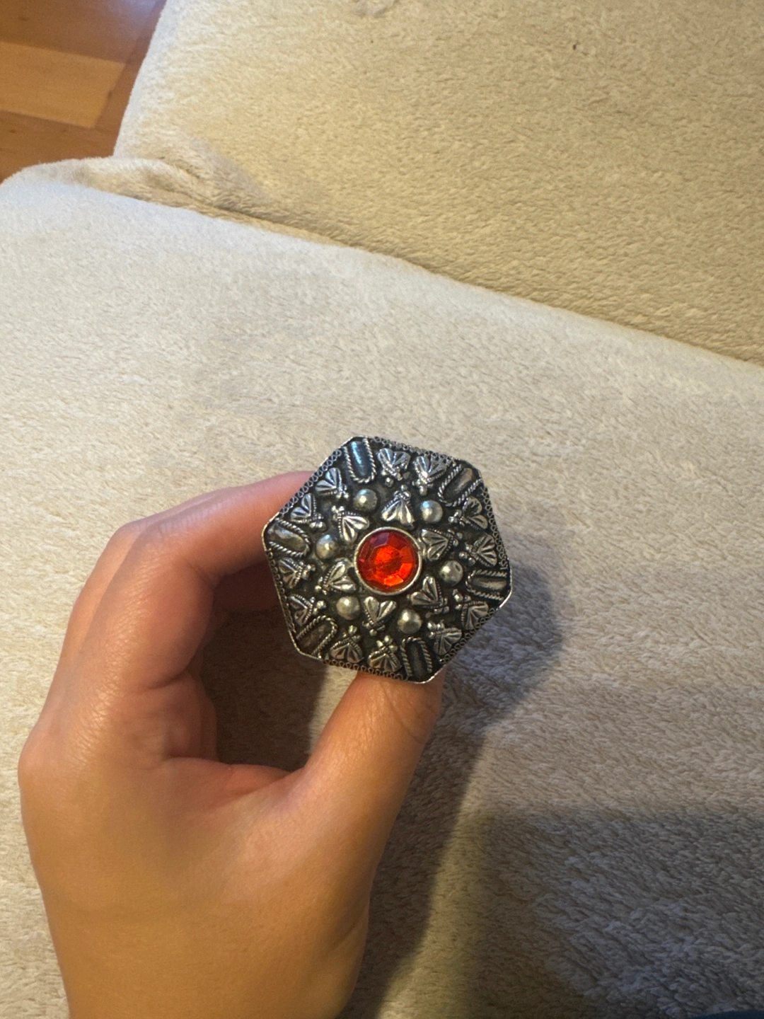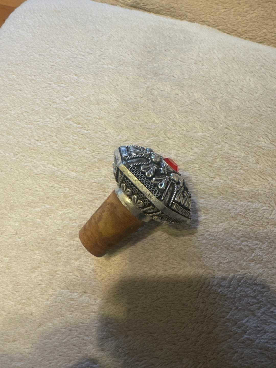 475Ornate silver wine bottle stopper with a red jewel. Has a cork stopper.