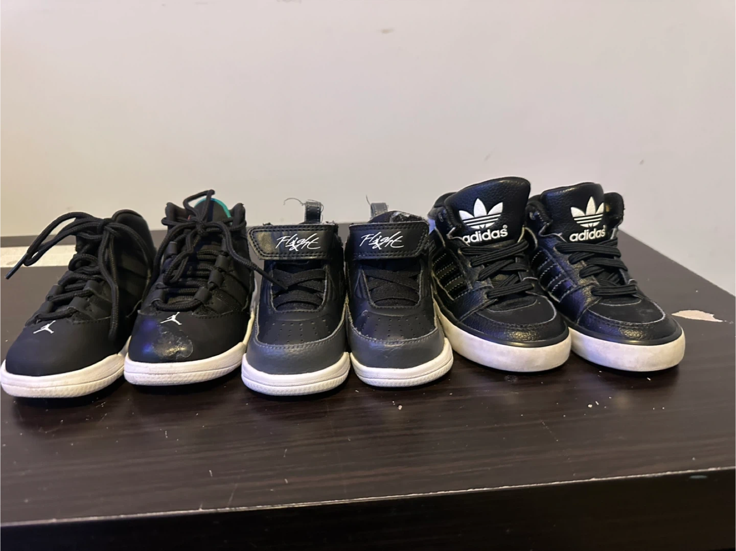 The adidas is size 5K, the Jordan’s are size 3C, and the other pair of Jordan’s are size 5C.