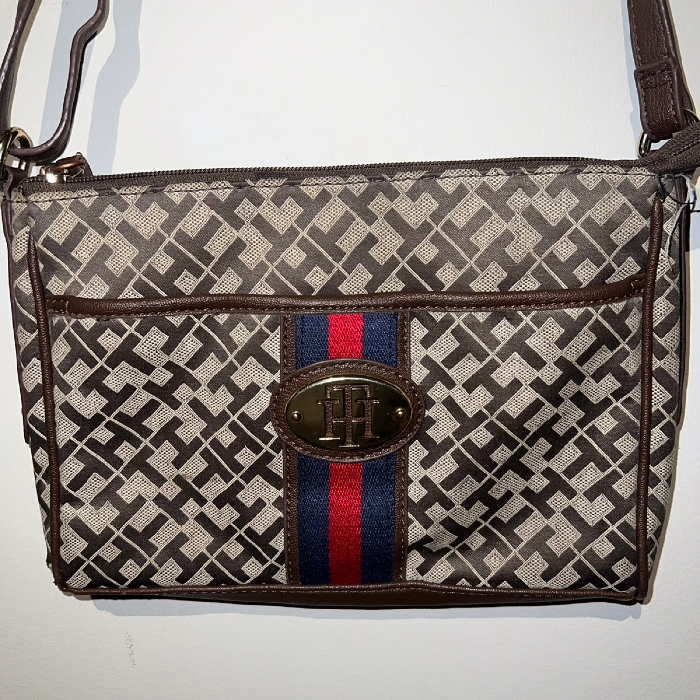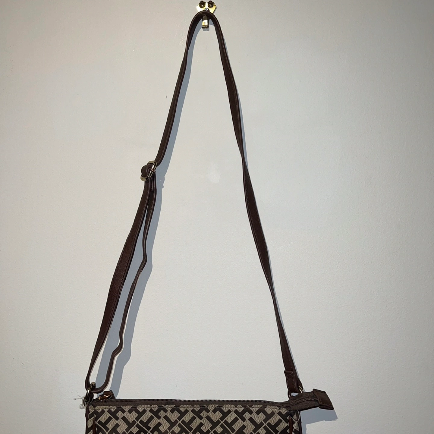 Brown and beige crossbody bag with a removable strap. Features a zipper closure and a pocket inside. The bag has a Tommy Hilfiger logo on the front.