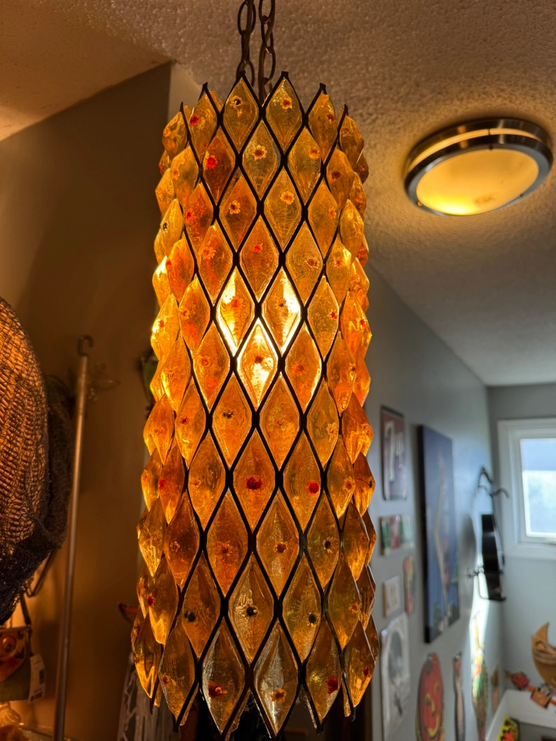 Amber lucite pendant light. Has small flowers encased in the glass. Awesome swag lamp from the 70s