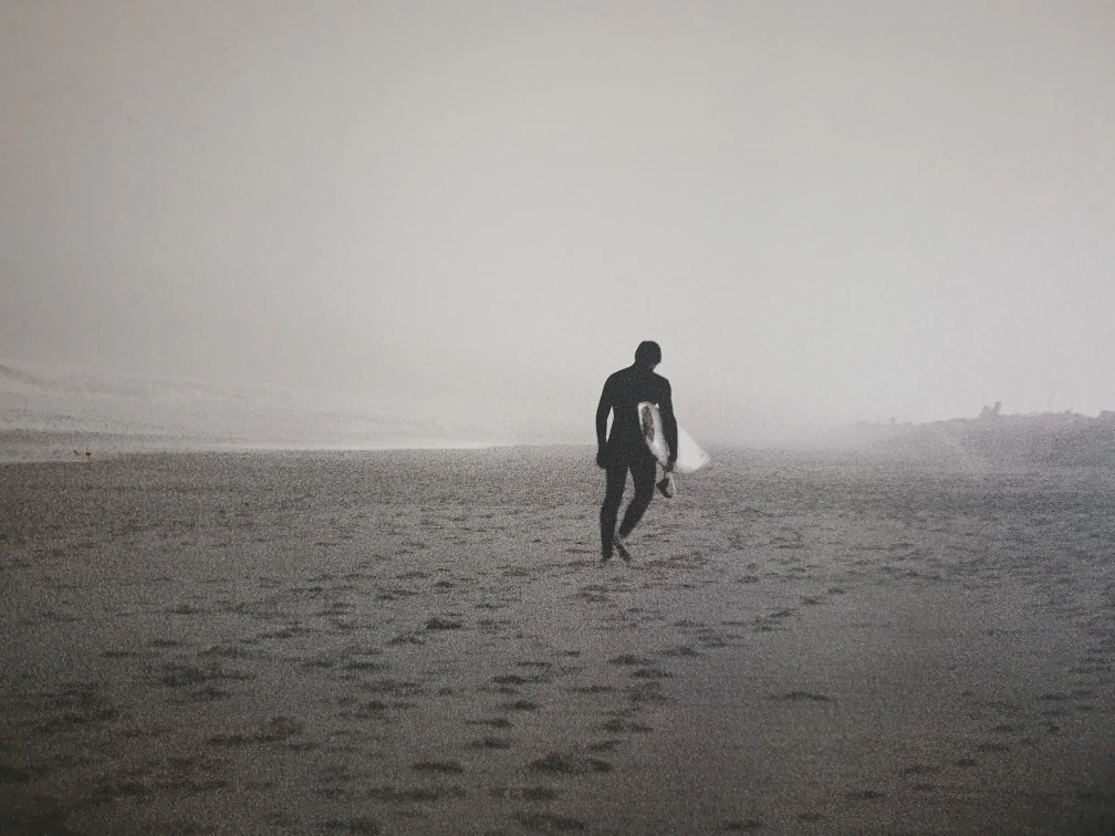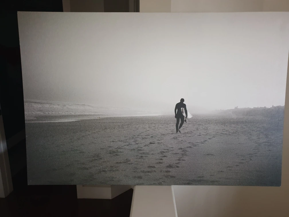 Canvas print of a surfer walking on the beach. Black and white photography. Dimensions are 46x31 inches.