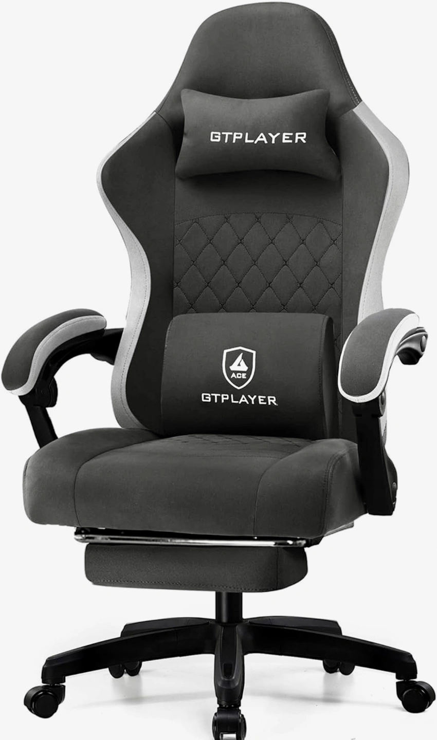 Grey and white gaming chair with a footrest. Features adjustable height, lumbar support and headrest.