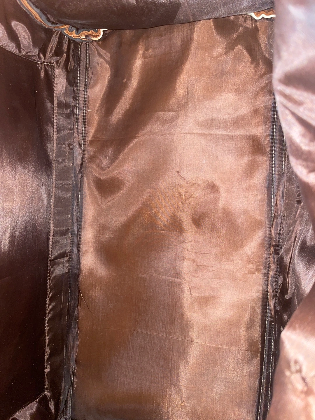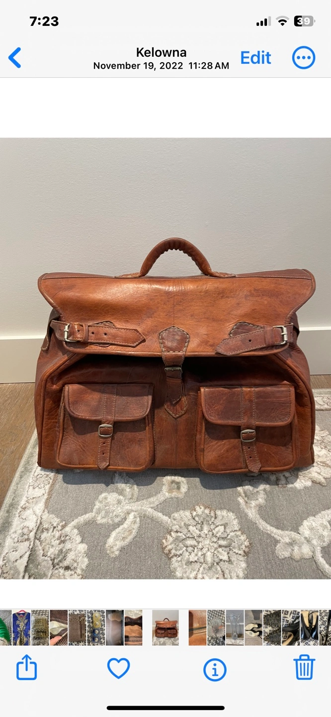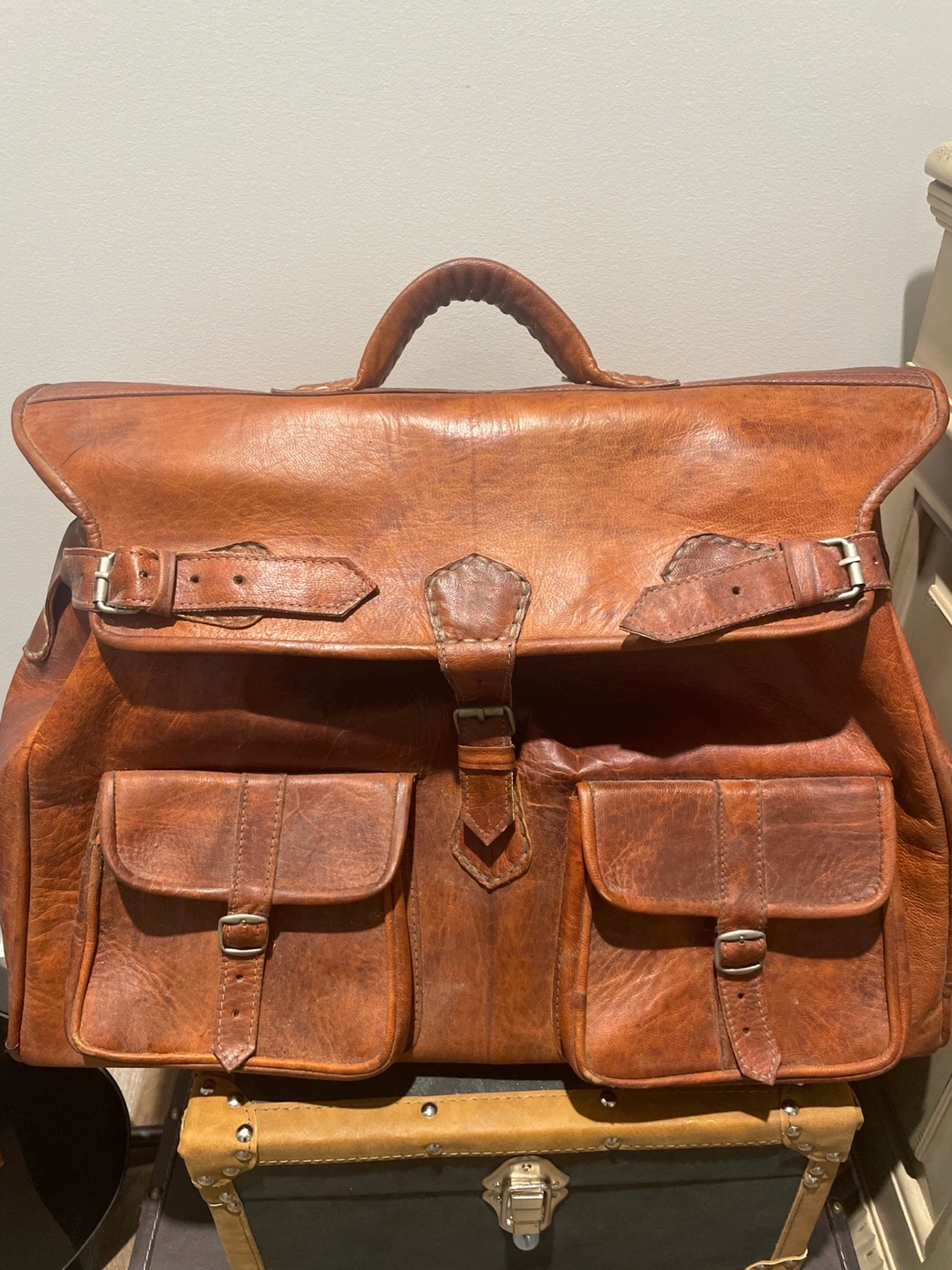 Large brown leather bag. Two front pockets with buckles. Top zipper closure. Brown fabric lining. Top handle. Used only as a decoration. Paid 160