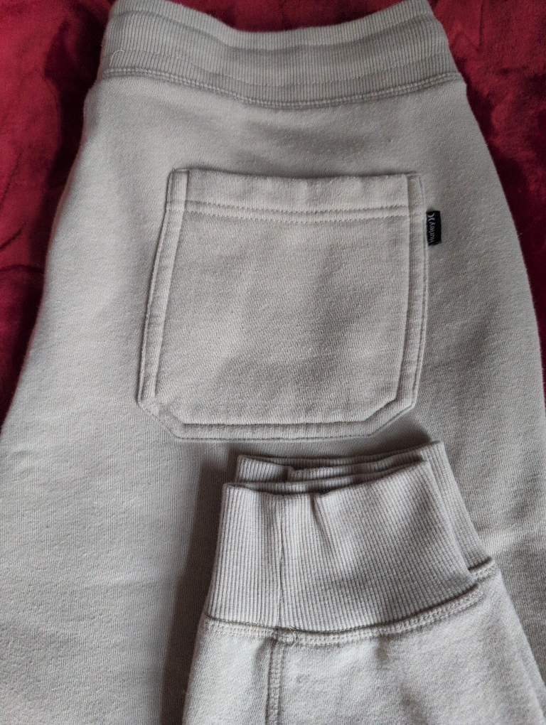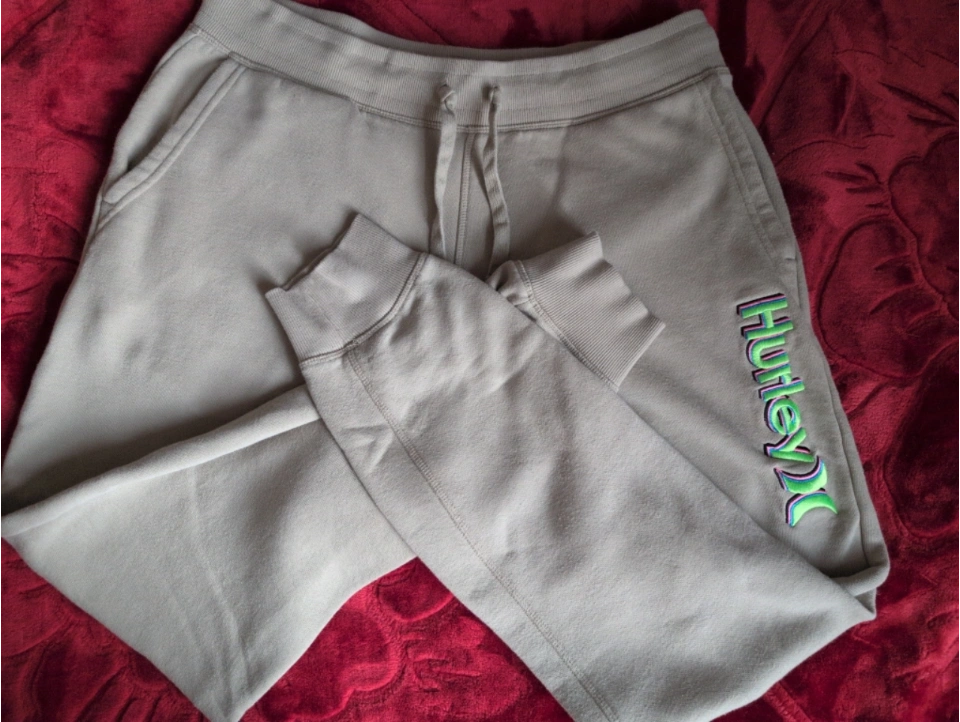 Beige color sweatpants with a small Hurley logo on the left leg. Drawstring waistband and cuffed legs. One back pocket.