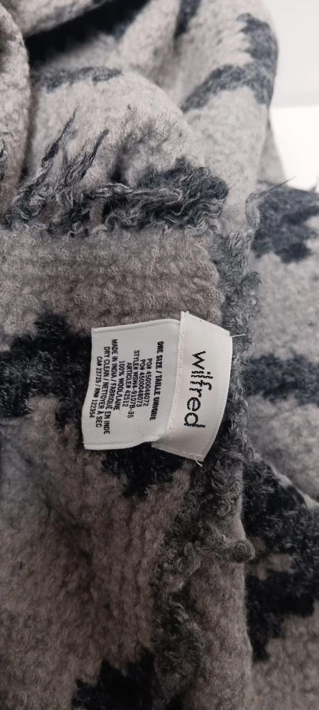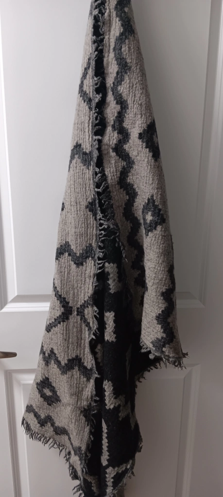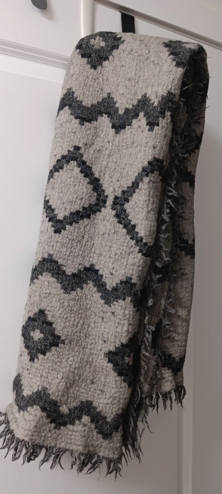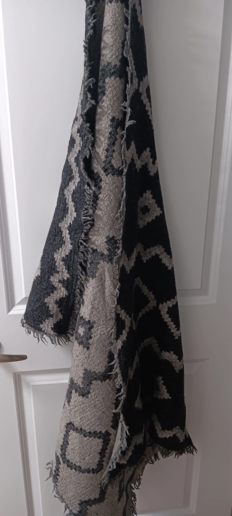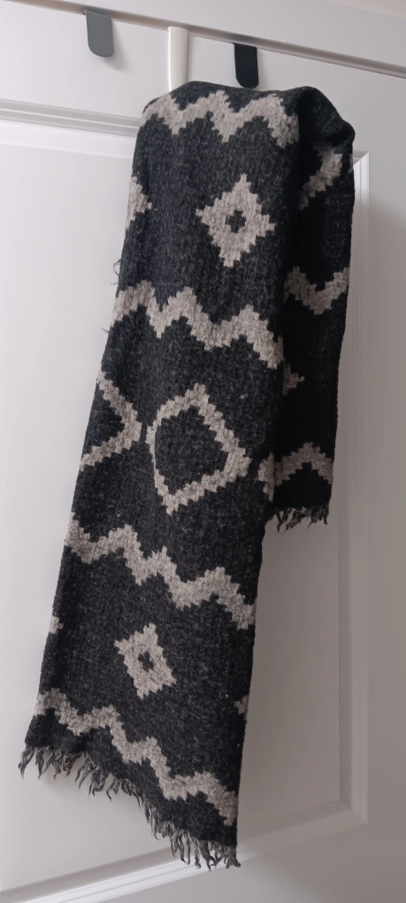 483Black and grey geometric pattern scarf. Has fringe on all edges.