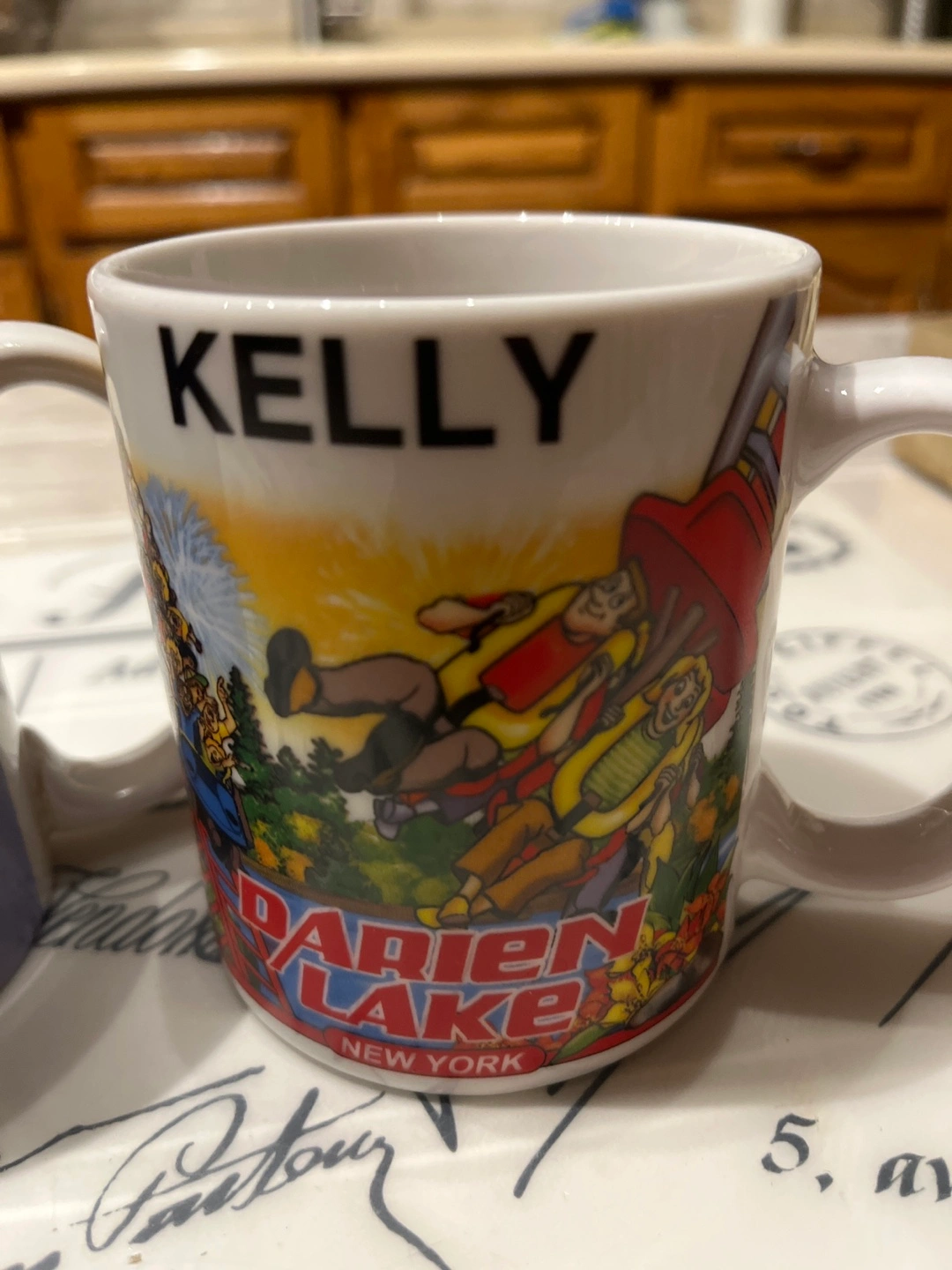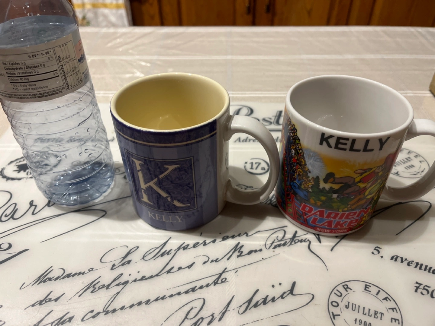 Two mugs with the name Kelly on them. One mug has a purple background with the letter K and the other mug has a picture of Darien Lake.