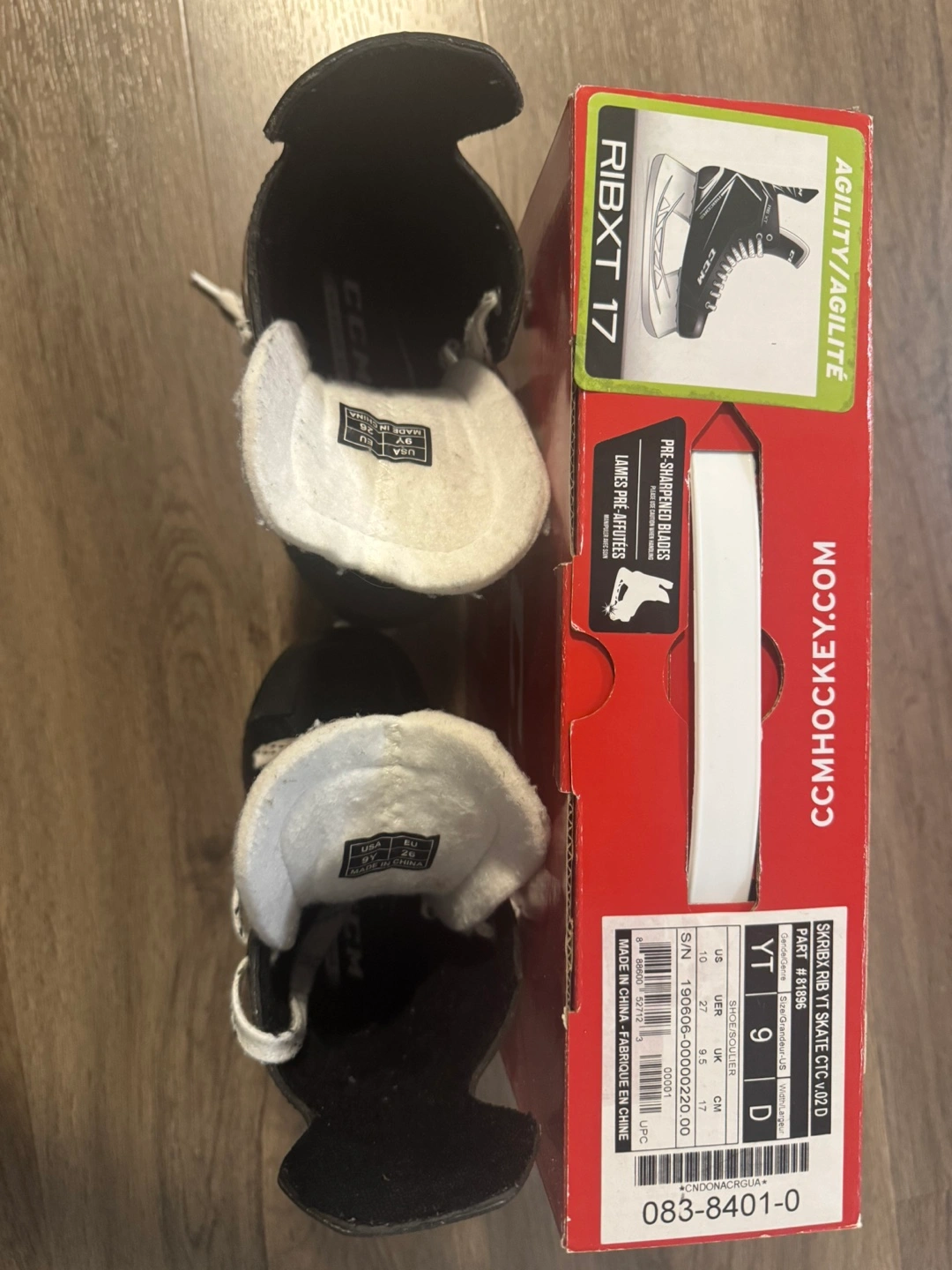 Black hockey skates with white and silver accents. Pre-sharpened blades. Size 9Y (US) or 26 (EU).