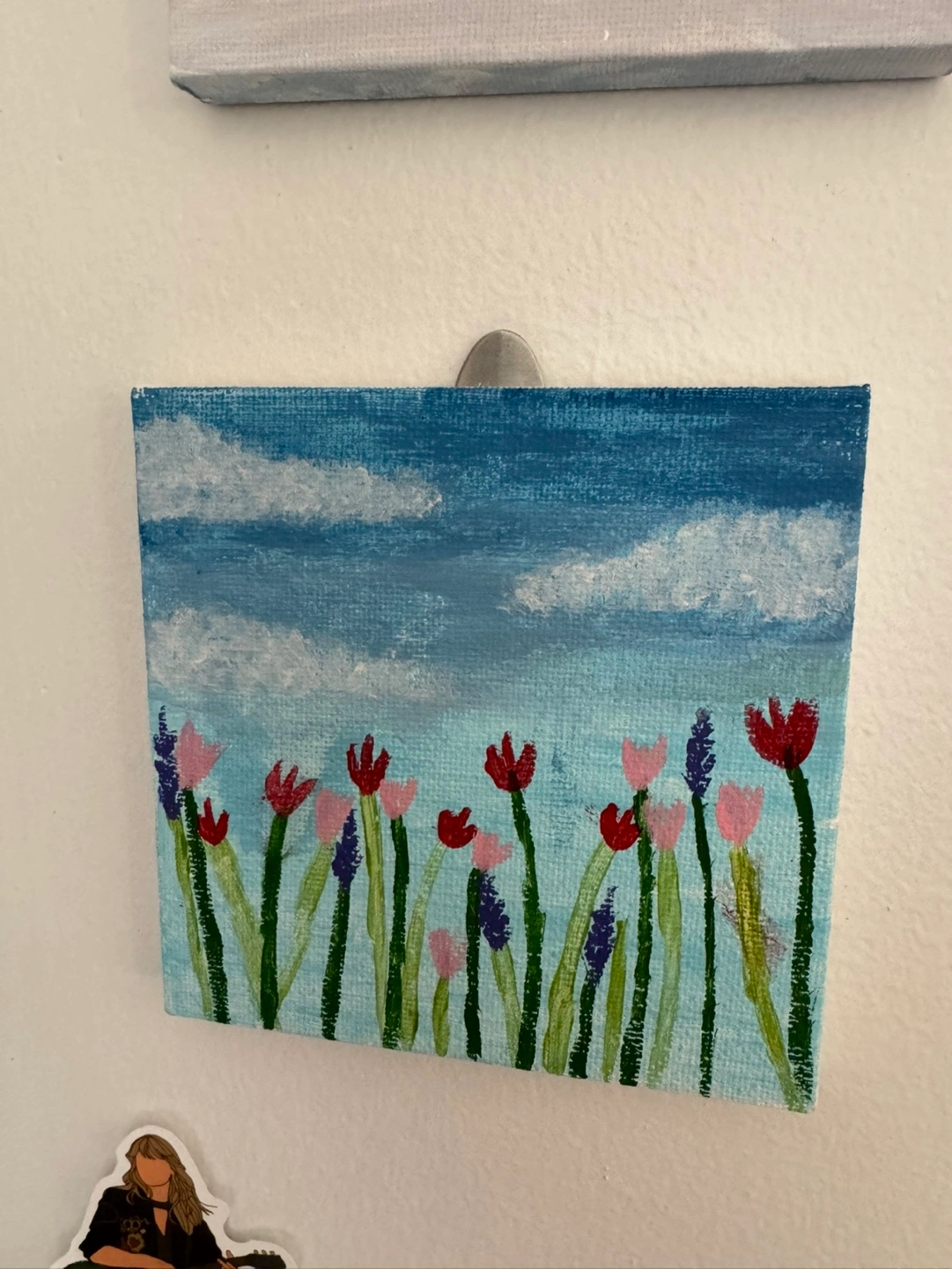 Small canvas painting of a field of flowers under a blue sky with white clouds. The painting has red, pink, and purple flowers with green stems on a light blue background.