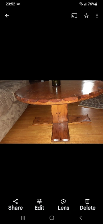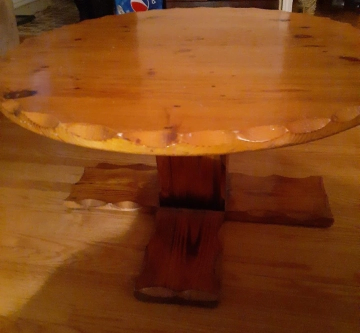 Round wooden coffee table with a unique design. Solid wood construction. Great for a farmhouse or rustic decor style. Diameter approx. 32 inches. 16 3/4 inches height!