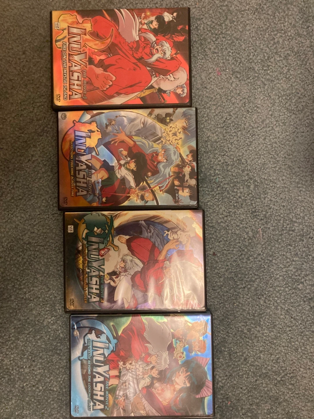 Four Inuyasha movies on DVD: Fire on the Mystic Island, Affections Touching Across Time, Swords of an Honorable Ruler, and The Castle Beyond the Looking Glass. All discs are in their original cases.