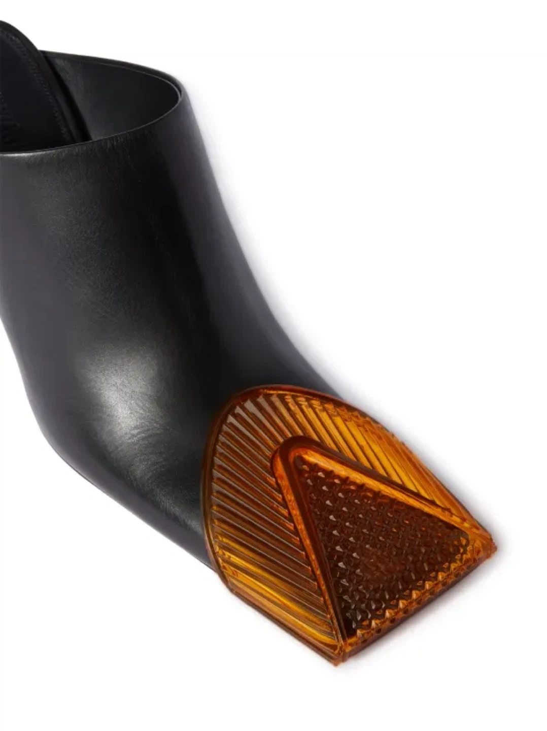 Stylish black leather mules designed with a striking amber-toned accent at the toe. These heeled shoes offer a sleek silhouette. Leather upper and lining.