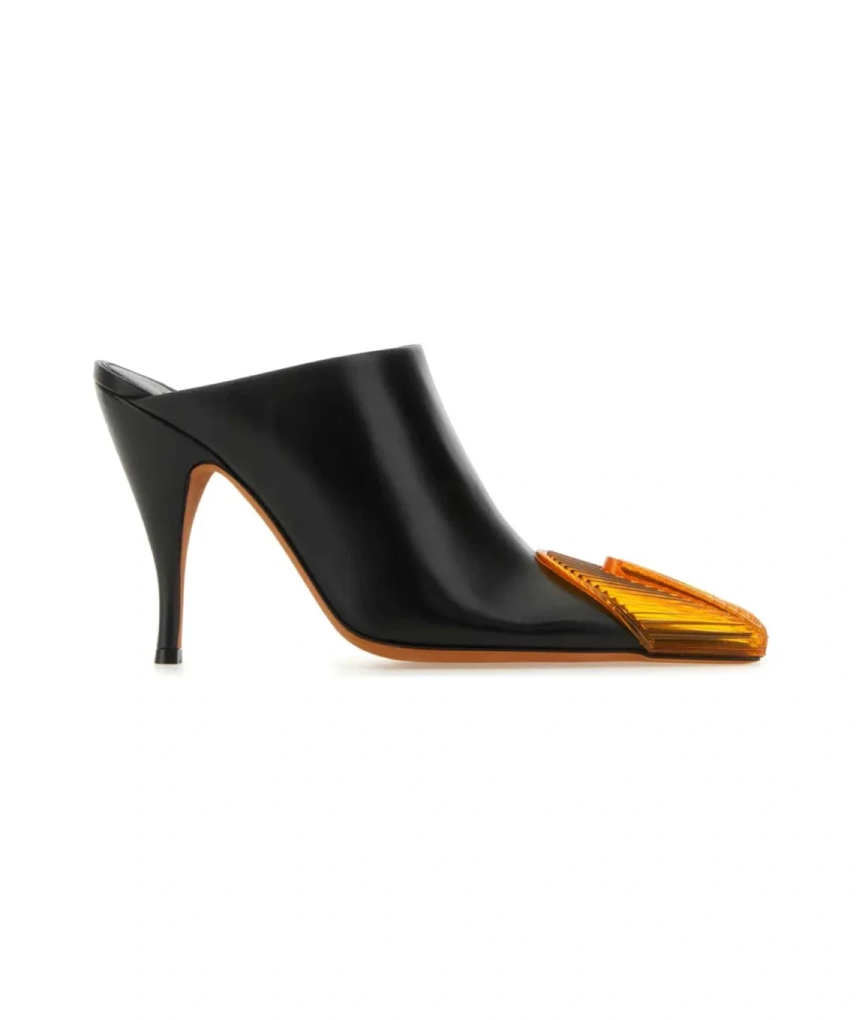 Stylish black leather mules designed with a striking amber-toned accent at the toe. These heeled shoes offer a sleek silhouette. Leather upper and lining.