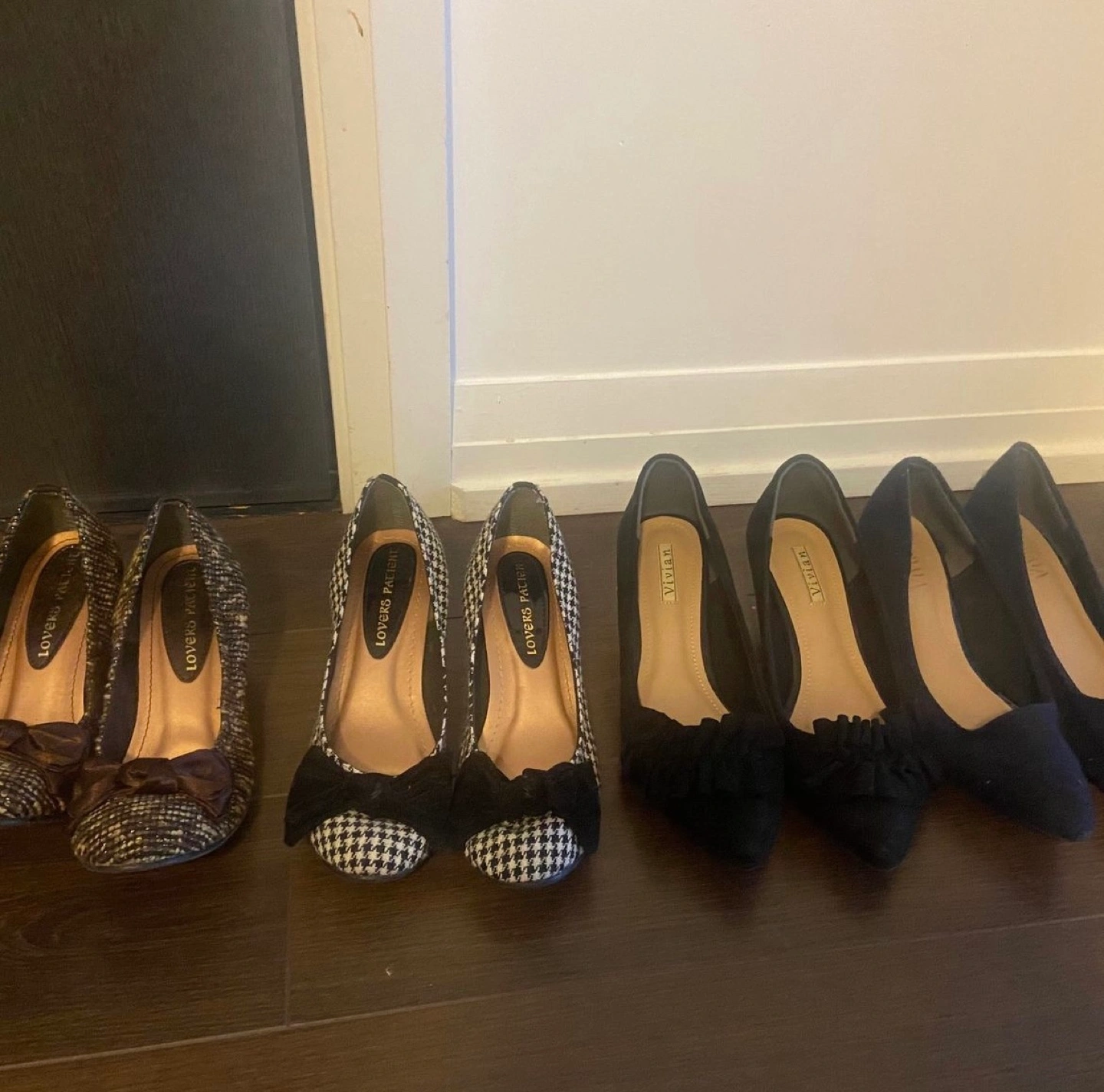 Four pairs of women's black heels. Two pairs have a black bow on the front and the other two pairs have a brown bow. One pair is a houndstooth pattern, the other three are solid black. They are from Japan so high quality! Good for office work or dinner!