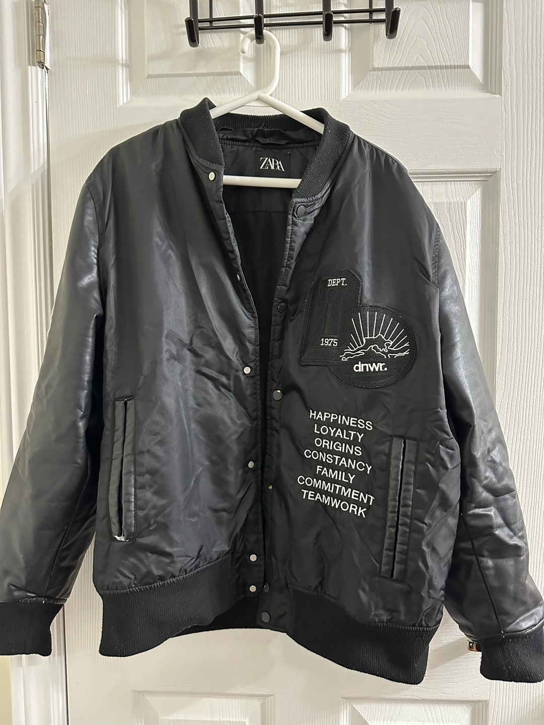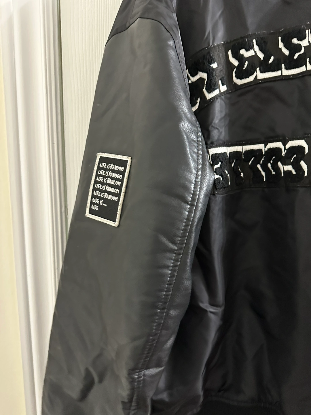 52Black bomber jacket with various patches on the back and sleeves. Size Large. for sale for pick up first come first serve cash only