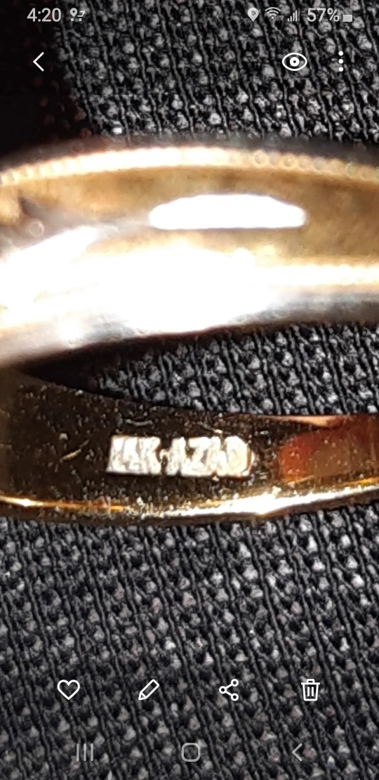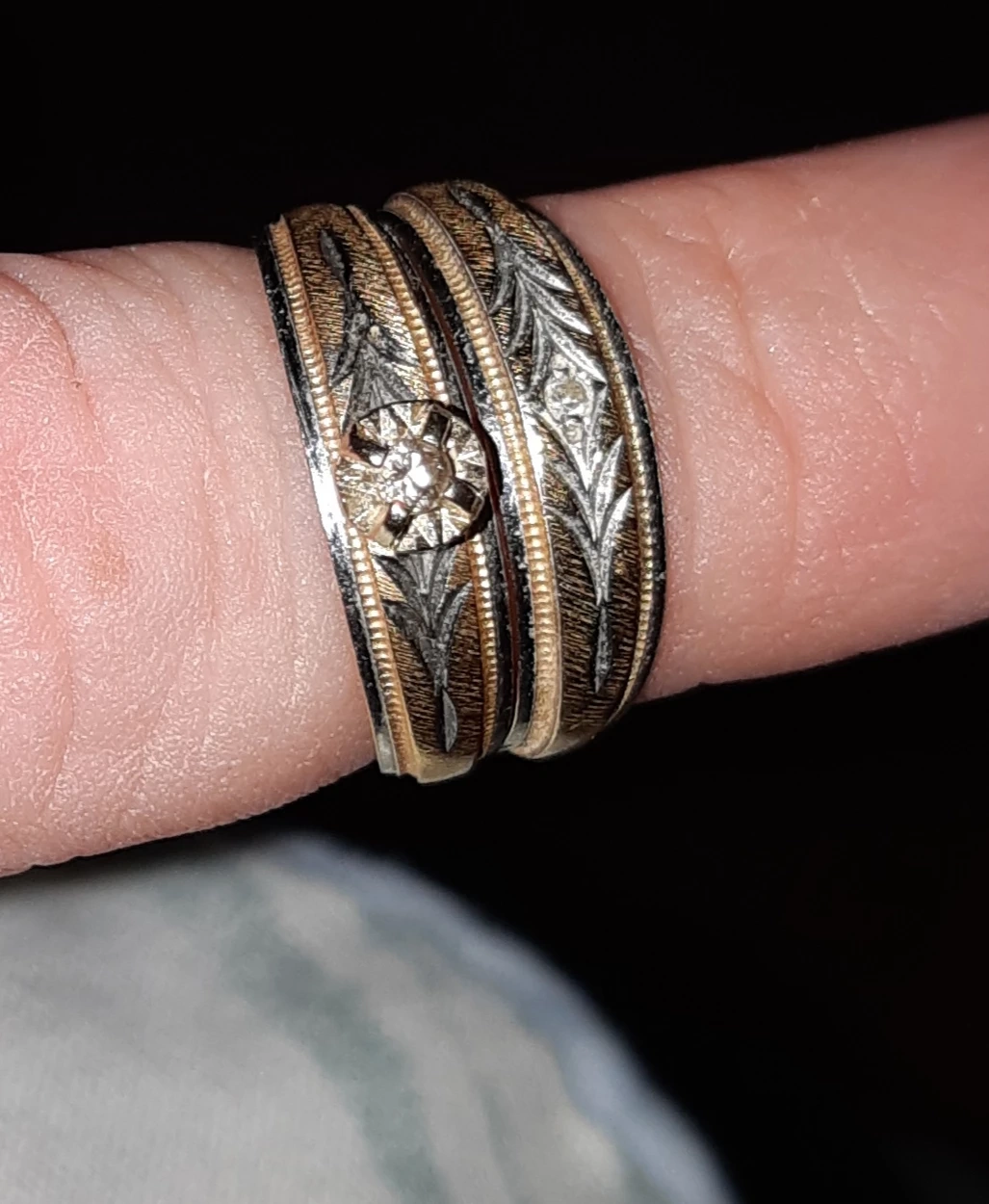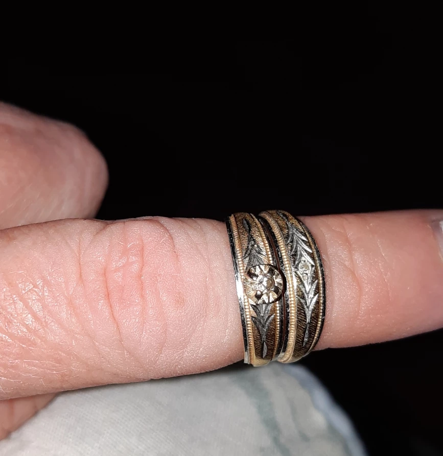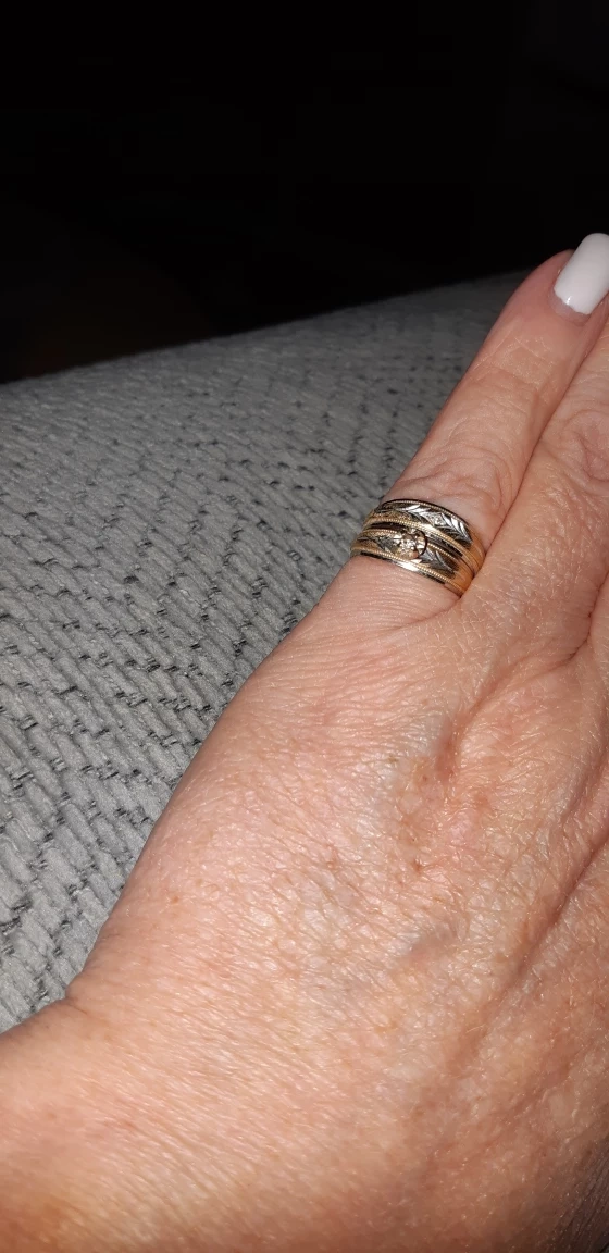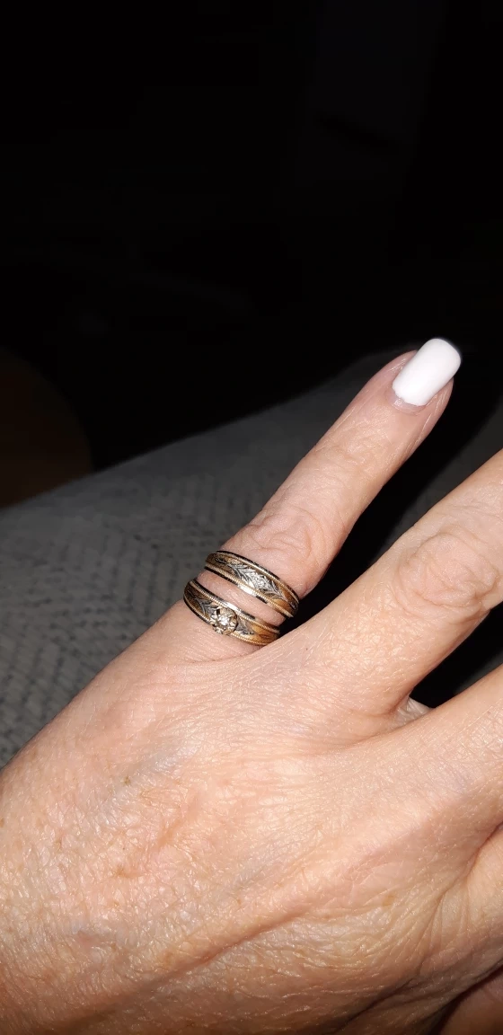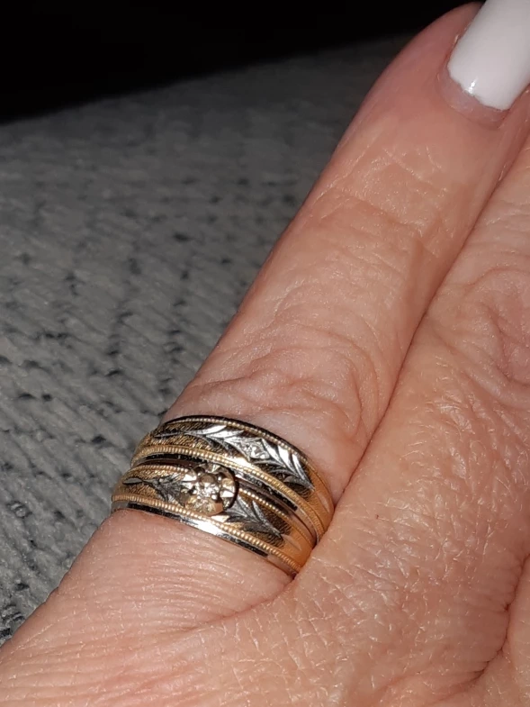 14k gold wedding band and engagement ring, engagement ring with a single diamond and wedding band with a small single diamond. Both are a size 5. Both bands are in good condition and have minimal wear.