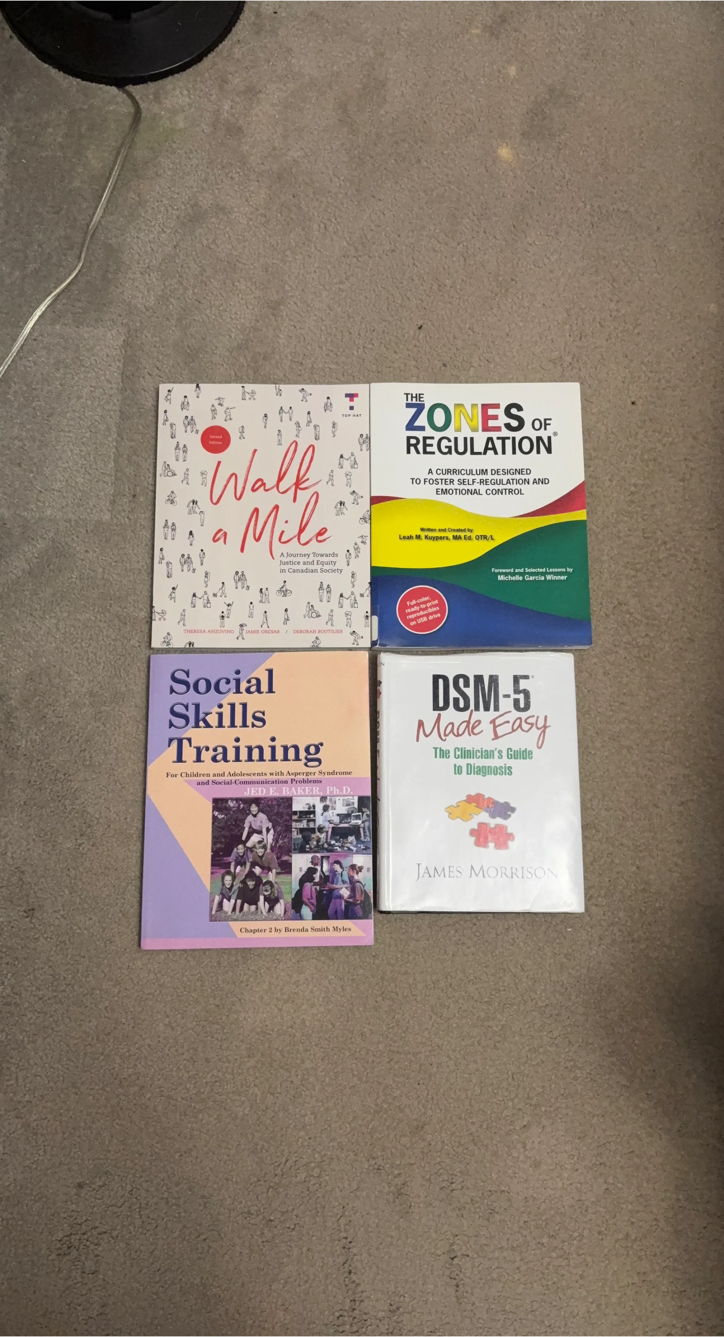This collection includes 'Walk a Mile: A Journey Towards Justice and Equity in Canadian Society', 'The Zones of Regulation: A Curriculum Designed to Foster Self-Regulation and Emotional Control', 'Social Skills Training For Children and Adolescents with Asperger Syndrome and Social-Communication Problems', and 'DSM-5 Made Easy: The Clinician's Guide to Diagnosis'. These books cover topics in social justice, emotional regulation, and clinical diagnosis.