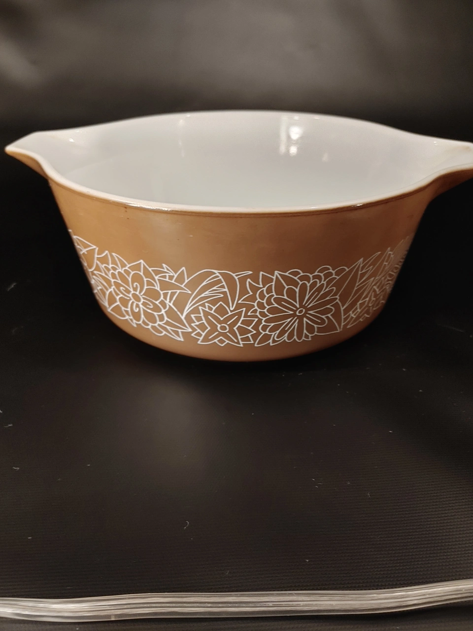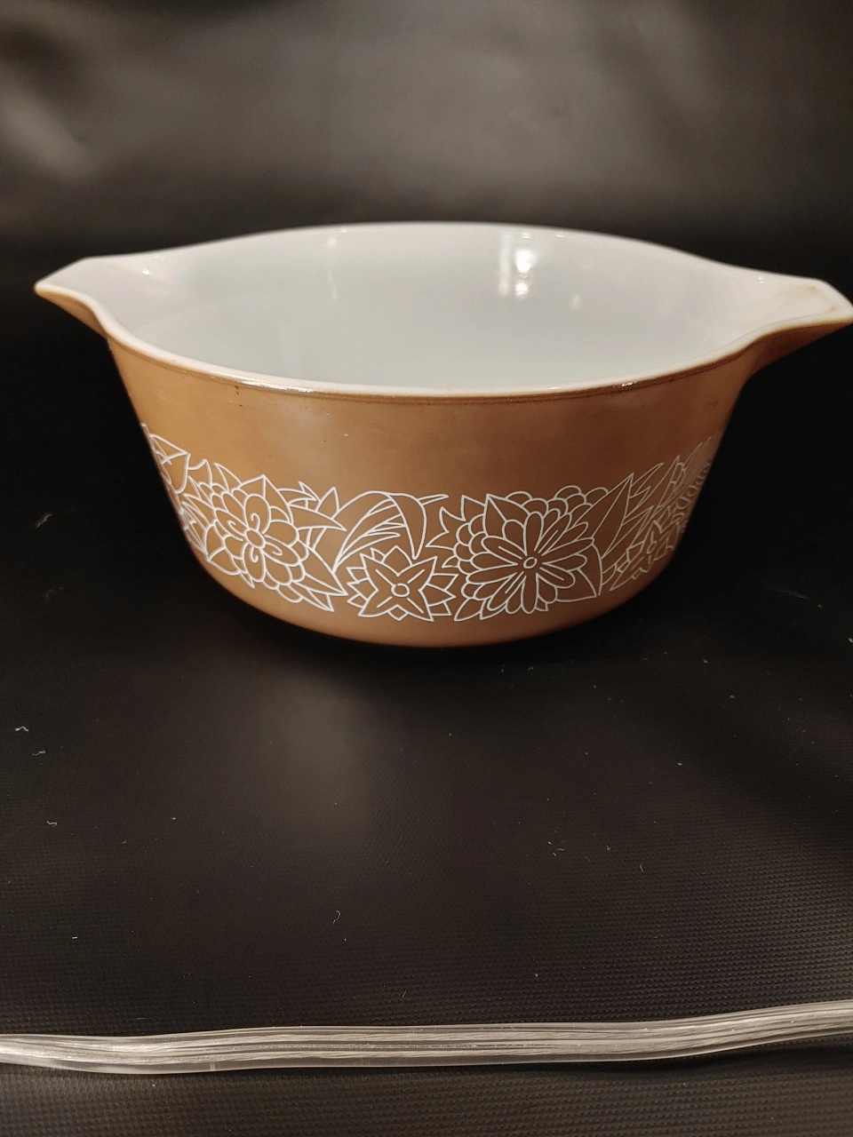 Vintage Pyrex mixing bowl. Brown with white floral design. No chips or cracks.