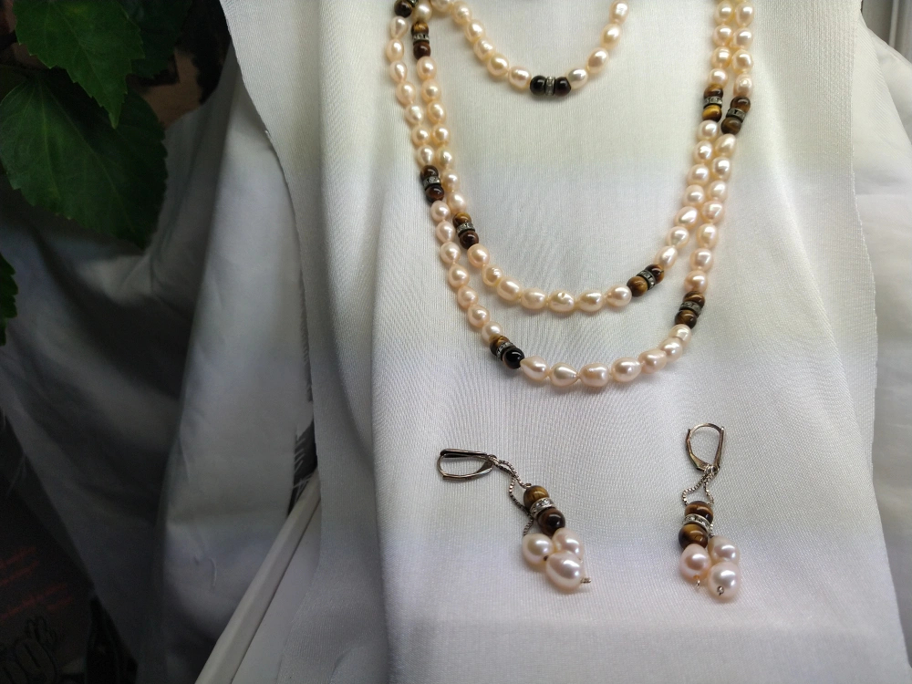 Pearl and Tiger Eye Necklace and Earrings Set