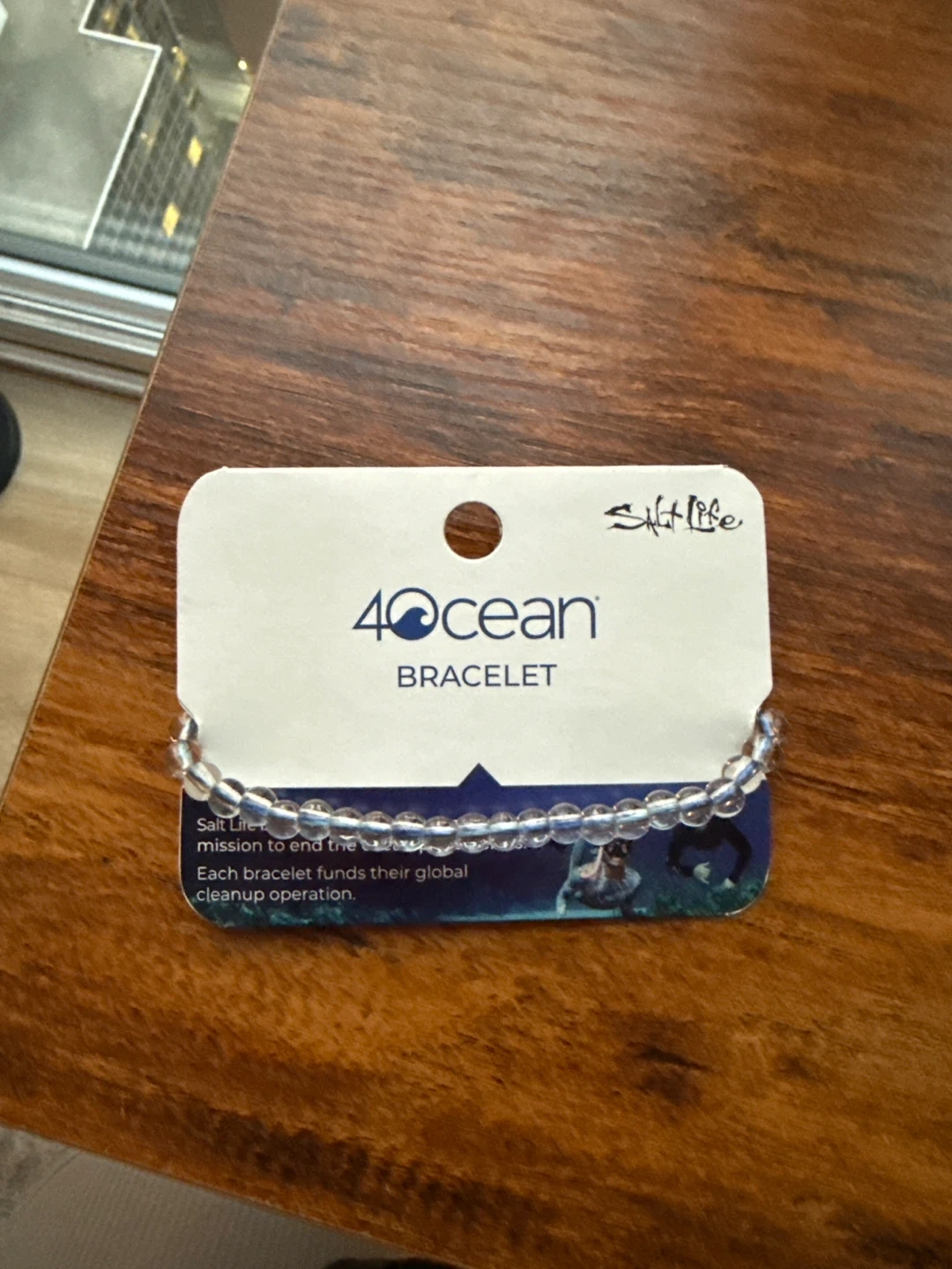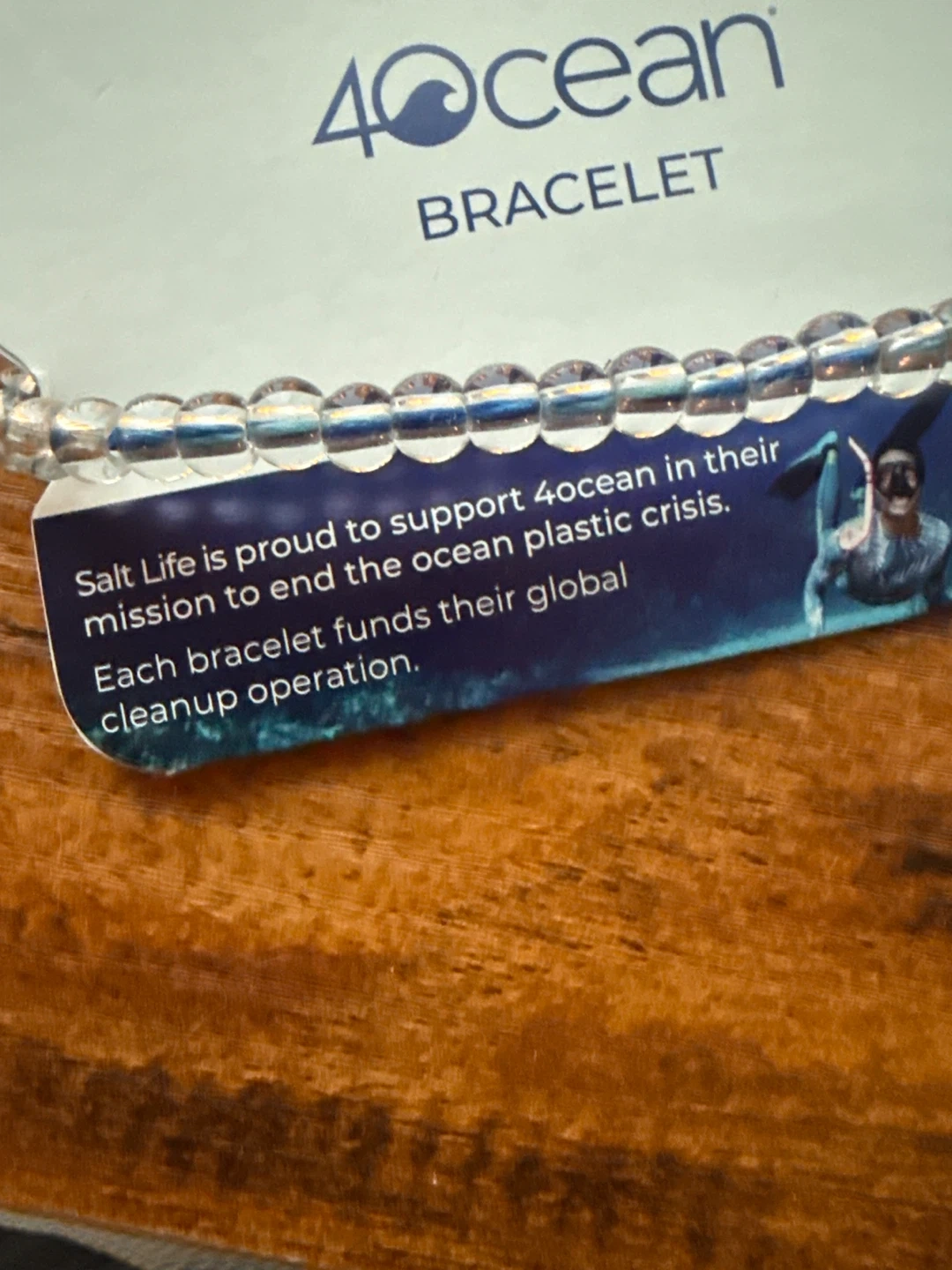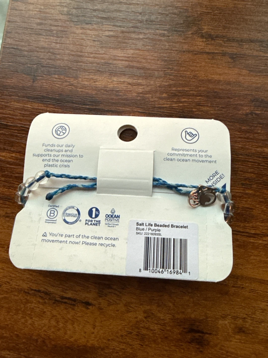 This 4ocean Salt Life beaded bracelet is blue and purple. It's designed to support ocean cleanup efforts. Each bracelet funds a global cleanup operation!