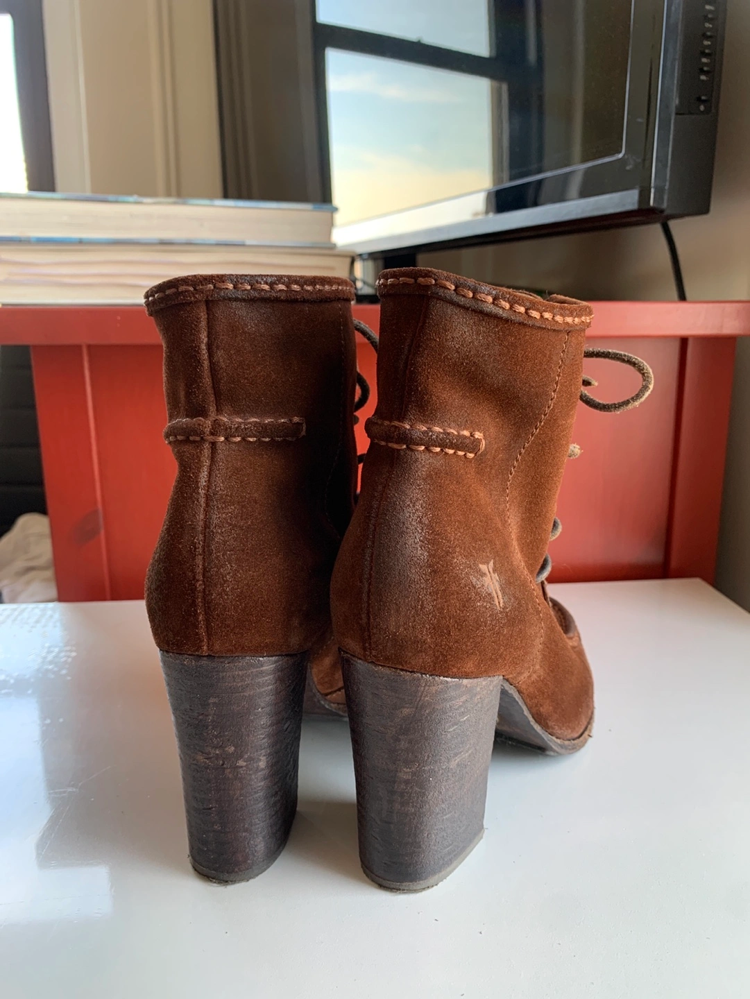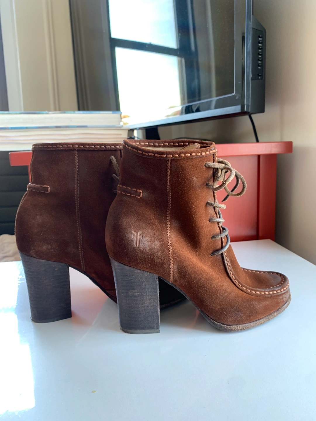 Brown suede ankle boots with lace-up front and block heel. Genuine leather lining, insole, and laces.