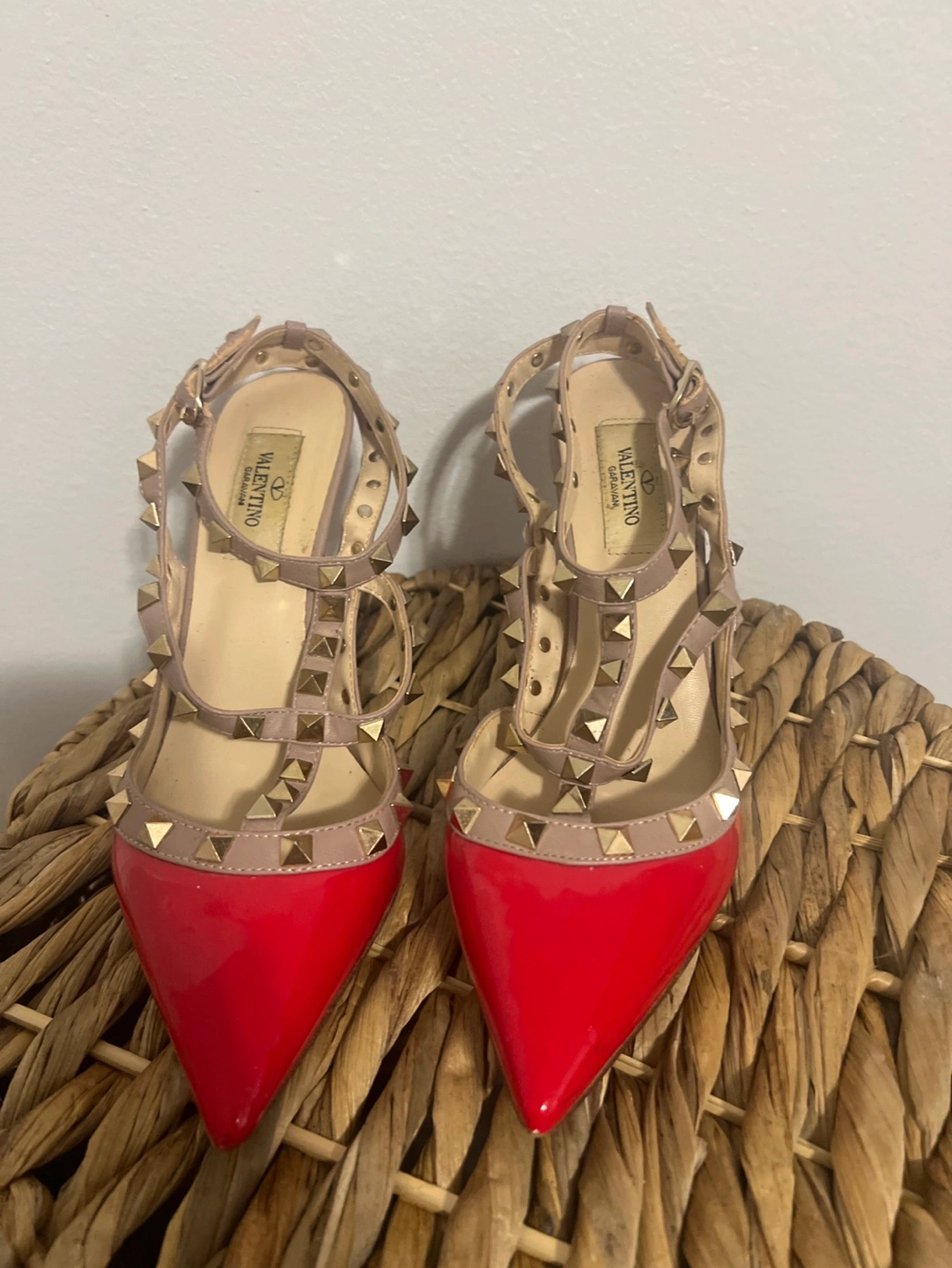 96Red patent leather heels with gold studs and ankle strap. Size 37.5.