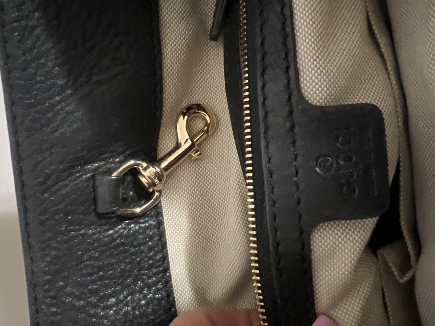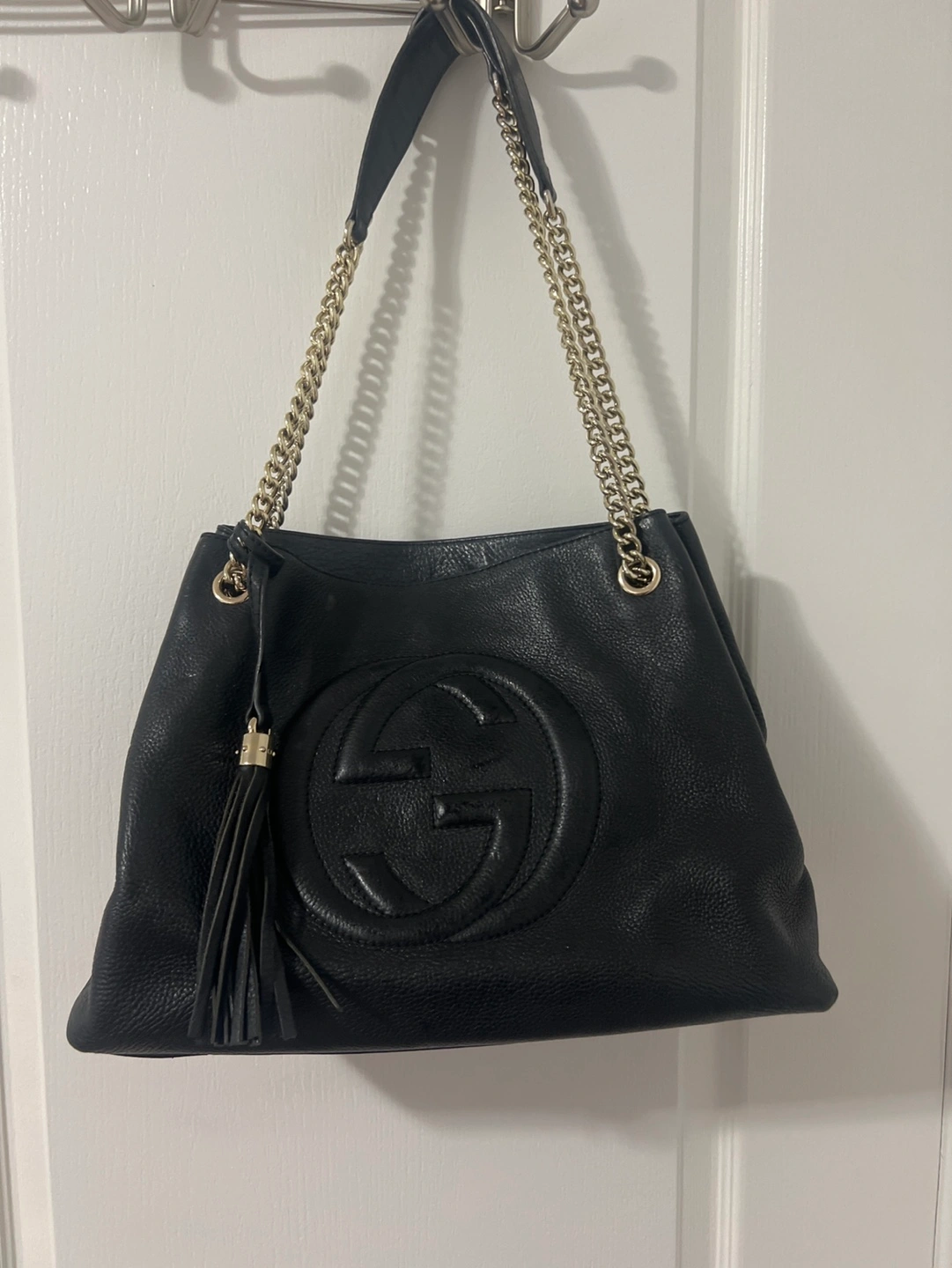 96Black leather chain bag with a gold chain strap and a gold GG logo. Includes a small leather tassel.