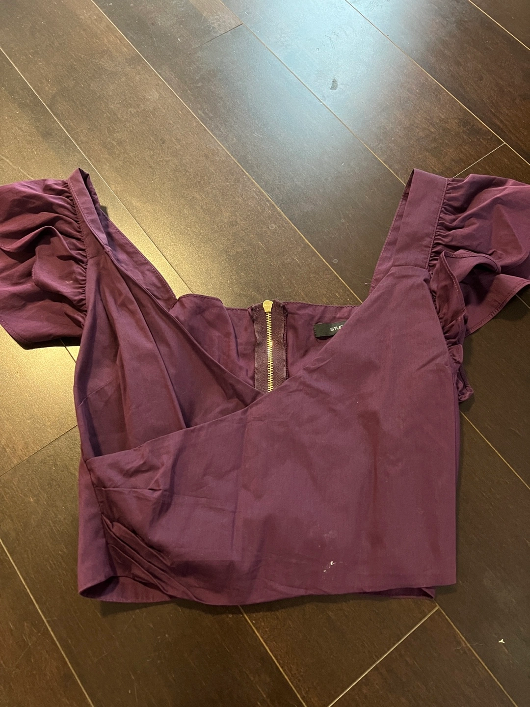 Purple crop top with short puff sleeves and gold zipper closure in the back. Size small. Colombian brand: Studio F Pick up downtown