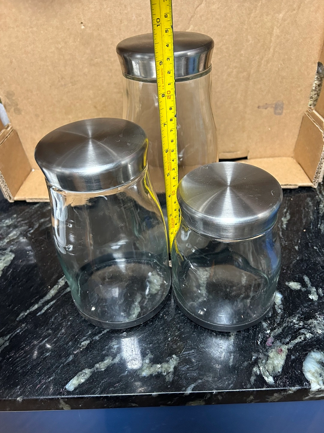 Set of 3 glass storage jars with stainless steel lids. Rubber on the bottom. Great for storing dry goods, snacks, or other kitchen items.