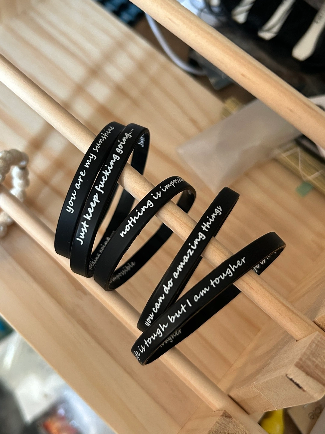 Set of 5 black silicone wristbands with motivational messages. The messages are: "You are my sunshine", "Just keep pushing going...", "Nothing is impossible", and "Life is tough but I am tougher". These are new never worn. They can be purchased individually for $3.50 or all 5 for $13.00. Price is firm.