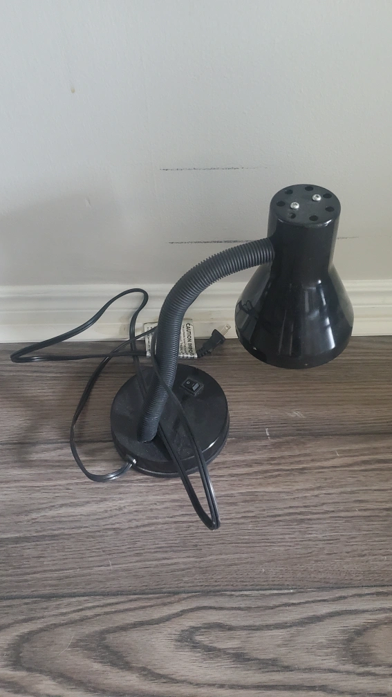 Black desk lamp with flexible neck and an on/off switch on the cord. Takes a standard light bulb.
