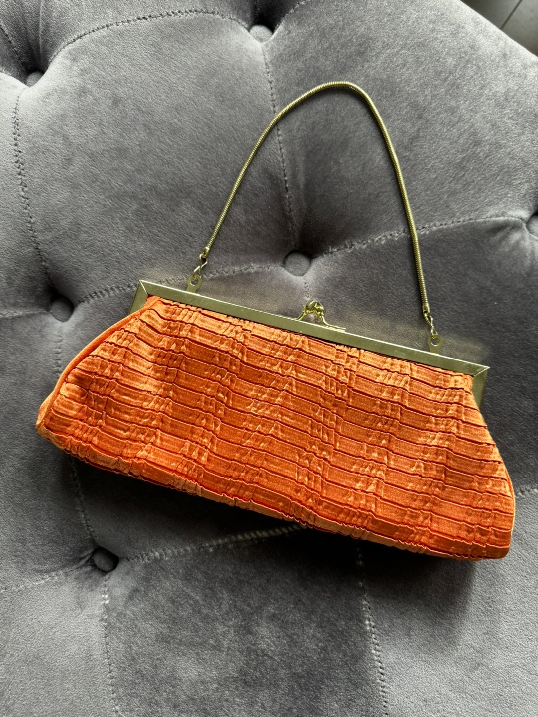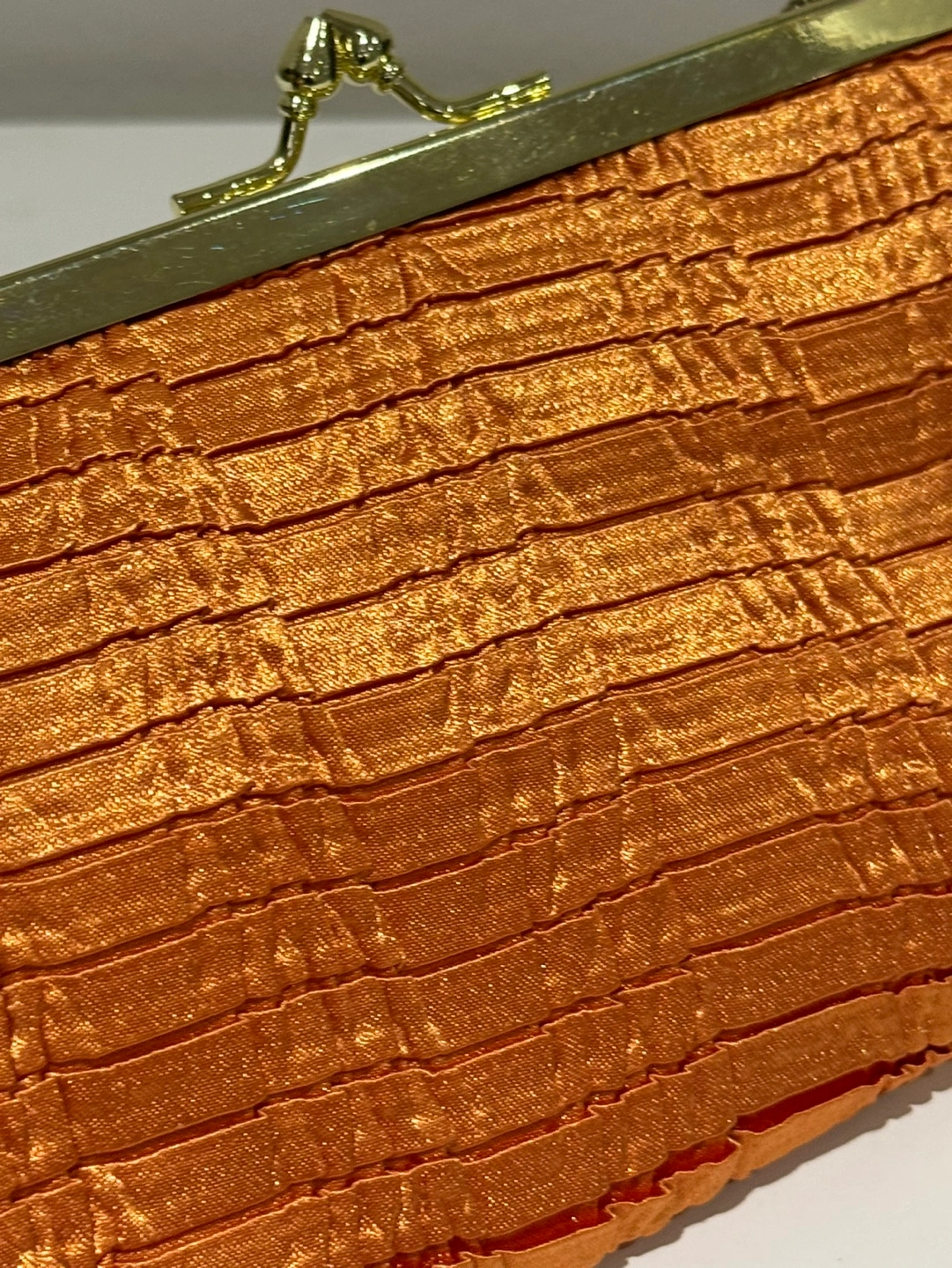 Orange satin clutch with a gold chain strap and a gold clasp.