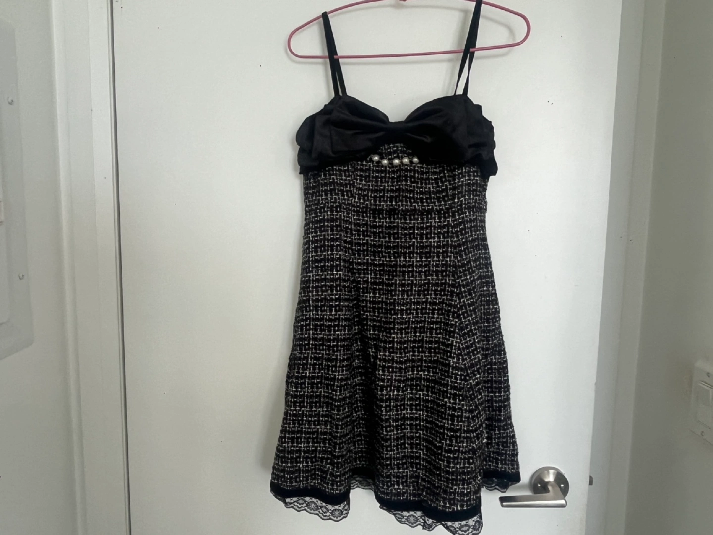 Black and white tweed dress with a black satin bow and pearl accents. Strapless. Lace trim at the bottom.