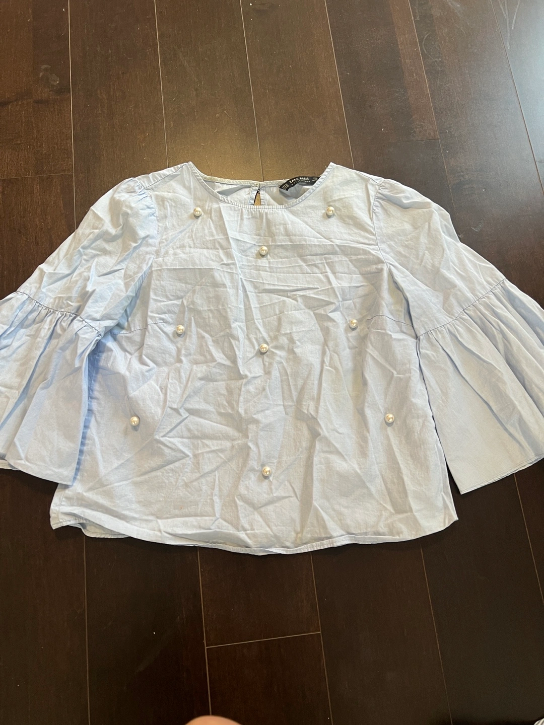 Light blue blouse with pearl detailing. Long-Mid sleeves. Size XS.