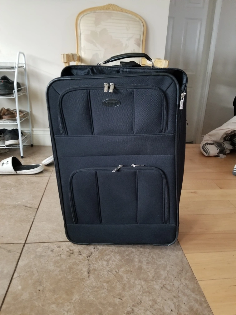 Large black suitcase with wheels, handle, and zippered compartments. It has an interior mesh pocket and a separate zippered compartment.
