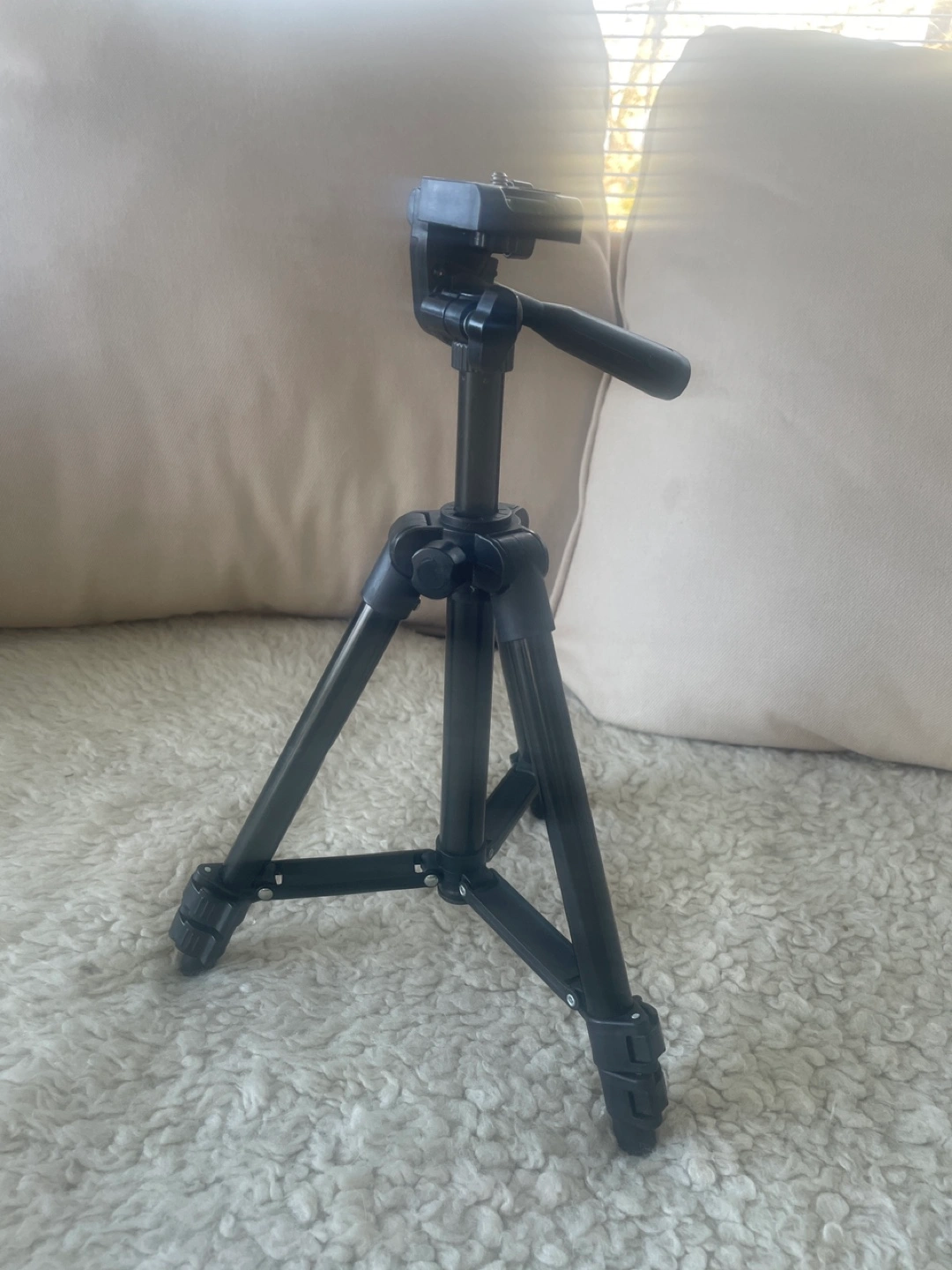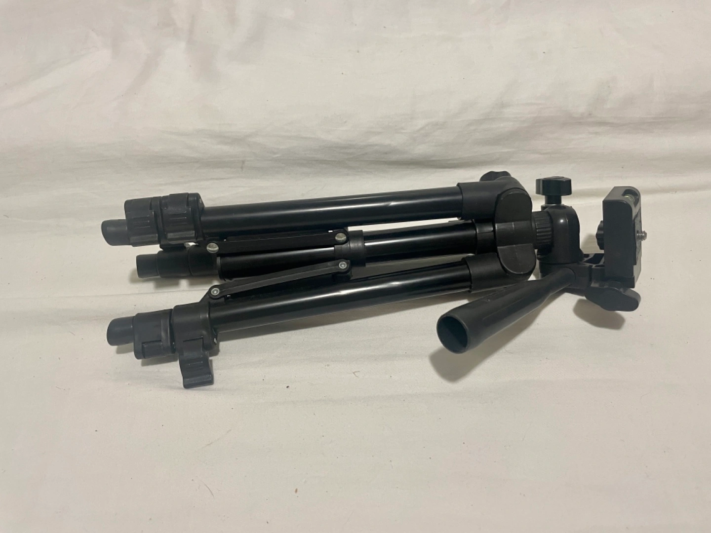 Black tripod with adjustable legs. Features a rotating head for camera positioning. For a lighter/smaller camera. Pick up Steveston North.