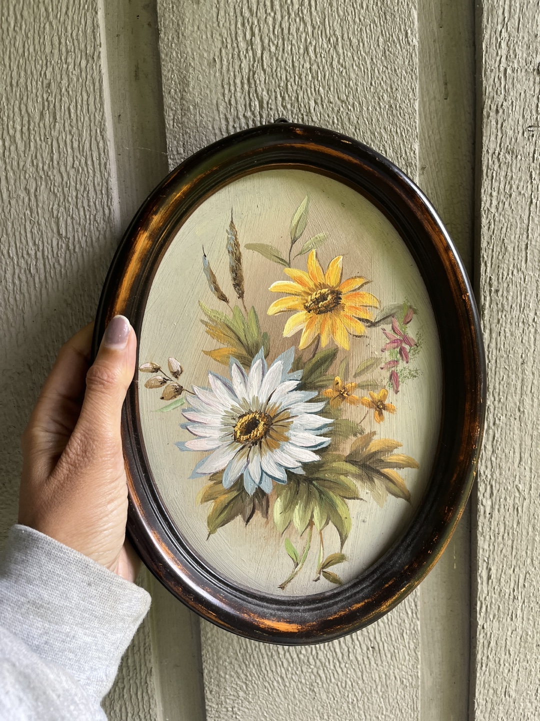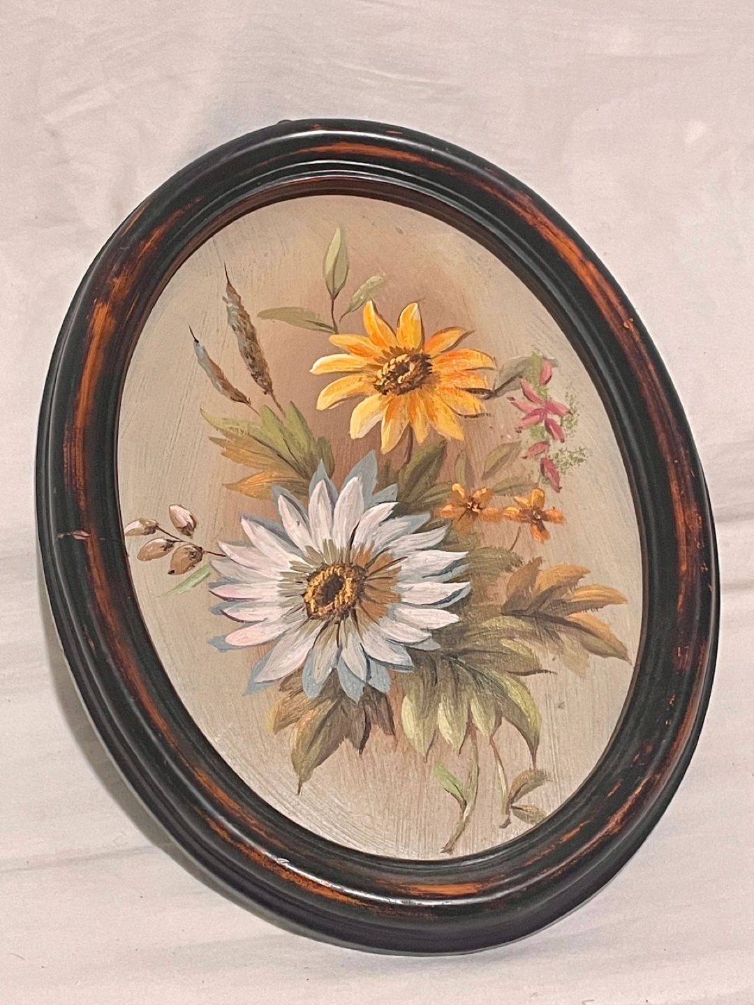 Super sweet hand painted vintage floral painting with frame and small hanging hook. There is a fine crack on the left side of the frame