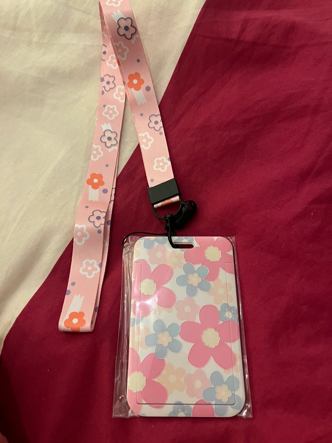 A pink floral ID card holder with a matching lanyard. It has a clear plastic front for displaying your ID. Perfect for work or school!