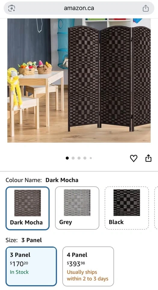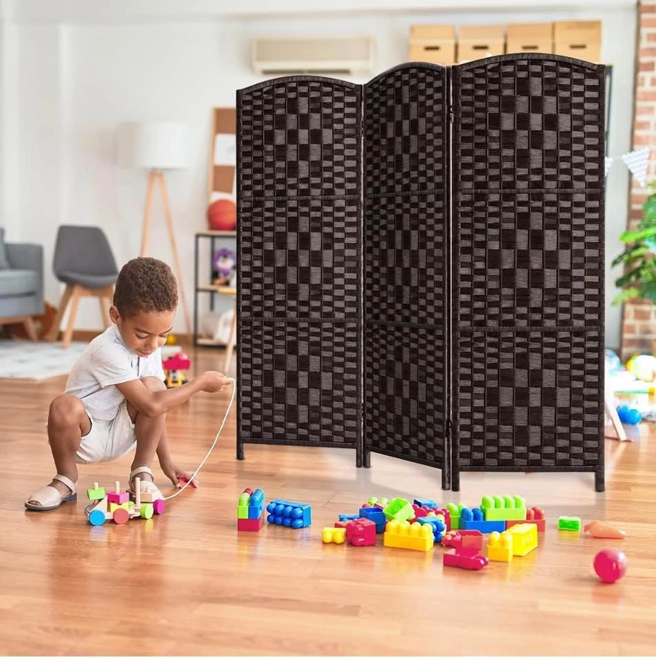 Stylish dark mocha room divider with a unique woven rattan design and 3 panels. Two-way hinged for easy configuration. Hand crafted, no assembly needed. Super easy to move and space-saving when folded. Measures approx 47.25in wide and 45.7in tall. Each panel is 15.75in wide. Great for privacy or dividing spaces. Condition: Brand New. Only opened to take photos, repackaged after photos. MRSP: $170.99. $45 OBO. Pickup is Oshawa or Scarborough. If ad is up, item is available.